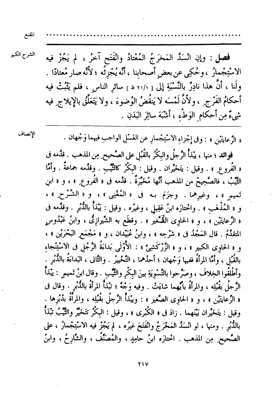 فوائد؛ منها، يبدَأُ الرَّجلُ والبِكْرُ بالقُبُلِ على الصَّحيحِ مِن المذهب. قدَّمه في «الفُروعِ». وقيل: يتَخَيَّران. وقيل: البِكْرُ كالثيبِ. وقدَّمه جماعة. وأمَّا الثَّيِّبُ، فالصحِيحُ من المذهب أنها مُخَيَّرةٌ. قدَّمه في «الفُروعِ»، و «ابنِ تَميمٍ»، وغيرِهما. وجزَمَ به في «المُغْنِي»، و «الشَّرْحِ»، و «المُذْهَبِ». واخْتارَه ابنُ عَقِيل، وغيرُه. وقيل: يَبدأ بالدُّبُرِ. وقدَّمه في «الرِّعايتَين»، و «الحاوي الصغير». وقطَع به الشِّيرازِى، وابنُ عَبْدُوس المتقدِّمُ. قال المَجْدُ في «شَرْحِه»، وابن عُبَيدان، و «مَجْمَع البَحْرَين»، و «الحاوي الكبير»، و «الزرْكَشِيِّ»: الأوْلَى بَداءَةُ الرَّجُلِ في الاسْتِنْجاءِ بالقُبُلِ، وأمَّا المرأةُ ففيها وَجْهان؛ أحدُهما، التخْييرُ. والثاني، البَداءَةُ بالدُّبُرِ. وأطْلقُوا الخِلافَ، وصَرَّحوا بالتسْويَة بينَ البِكْرِ والثيبِ. وقال ابنُ تَميم: يبدأ الرجلُ بقُبُلِه، والمرأةُ بأيهما شاءَتْ. وفيه: وجه؛ تبْدأ المرأةُ بالدُّبُر. وقال في «الرعايتَين»، و «الحاوي الصَّغير»: ويبدَأُ الرجلُ بقُبُلِه، والمرأةُ بدُبُرِها. وقيل: يتَخَيران بَينَهما. زادَ في «الكُبْرى»، وقيل: البِكْرُ تتَخَيَّر والثيبُ تبْدأ بالدبُرِ. ومنها، لو انْسَدَّ المَخْرَج وانْفَتَحَ غيرُه، لم يَجُزْ فيه الاسْتِجْمارُ، على الصحيح مِنْ المذهب. اخْتارَه ابن حامِدٍ، والمُصَنف، والشارِحُ، وابن