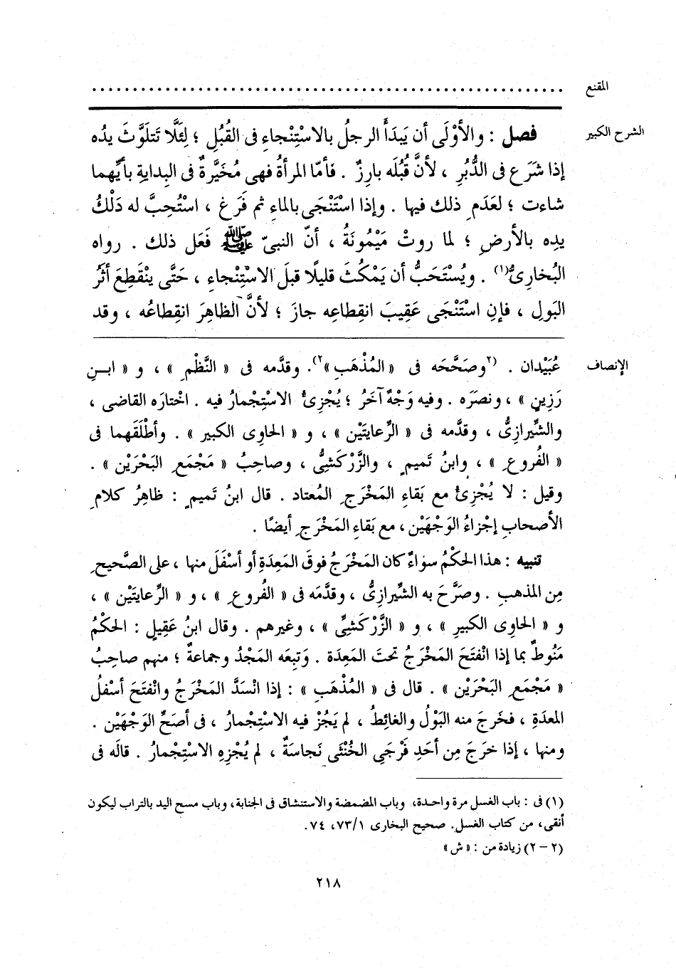تنبيه: هذا الحكْمُ سواء كان المَخْرَجُ فوقَ المَعِدَةِ أو أسْفَلَ منها، على الصّحيحِ مِن المذهبِ. وصَرَّحَ به الشِّيرازِيُّ، وقدَّمَه في «الفُروعِ»، و «الرِّعايتَين»، و «الحاوي الكبيرِ»، و «الزّرْكَشِيِّ»، وغيرهم. وقال ابن عَقِيلٍ: الحكْمُ مَنُوطٌ بما إذا انْفتَحَ المَخْرَجُ تحتَ المَعِدَة. وَتبِعَه المَجْدُ وجماعة؛ منهم صاحِبُ «مَجْمَع البَحْرَين». قال في «المُذْهَبِ»: إذا انْسَدَّ المَخْرَجُ وانْفتَحَ أسْفلُ المعدَةِ، فخرجَ منه البَوْلُ والغائِطُ، لم يَجُزْ فيه الاسْتِجْمارُ، في أصَحِّ الوَجْهَين. ومنها، إذا خرَجَ مِن أحَدِ فَرْجَي الخُنْثَى نَجاسَةٌ، لم يُجْزِهِ الاسْتِجْمارُ. قاله في