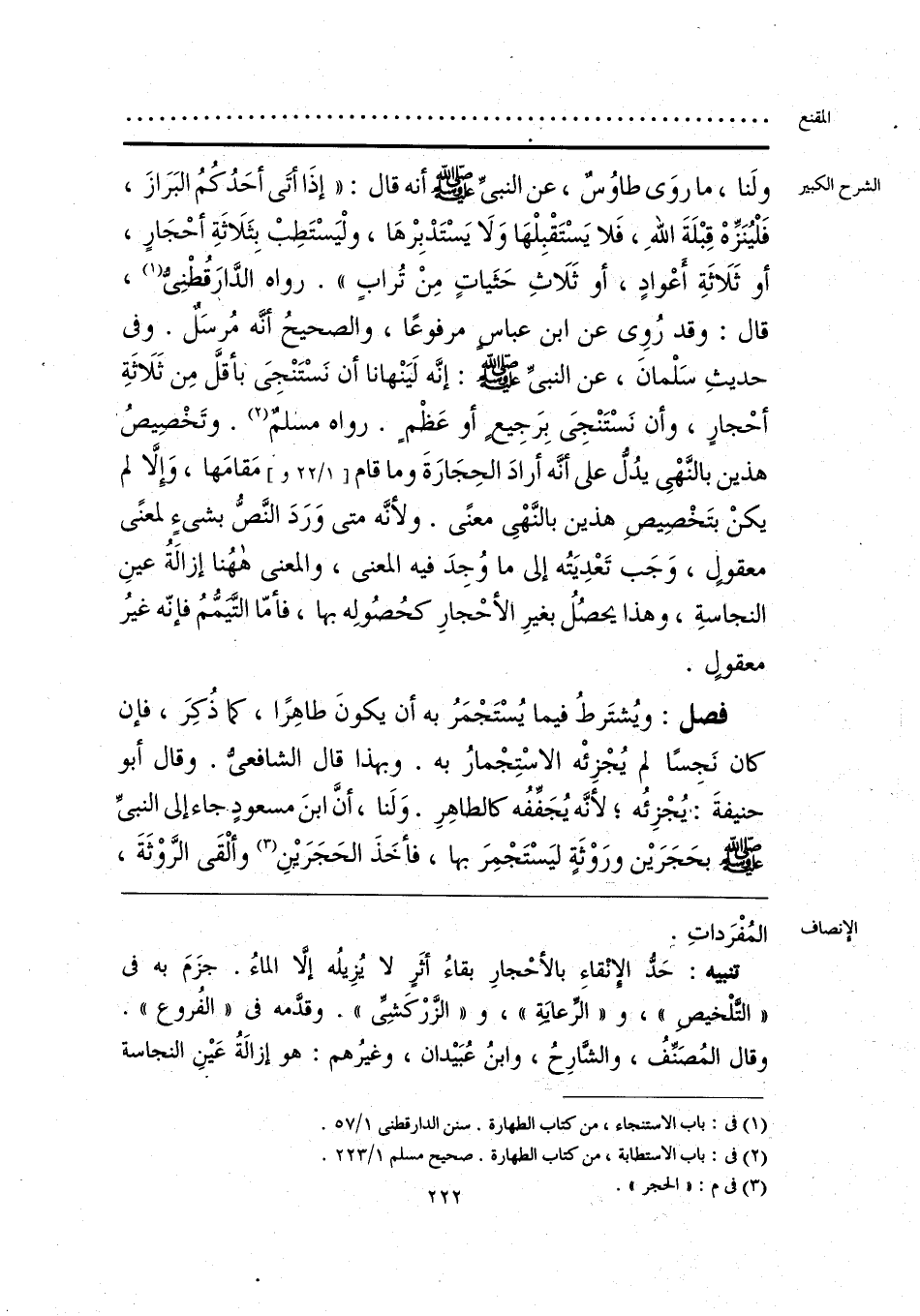 تنبيه: حَدُّ الإنْقاءِ بالأحْجارِ بقاءُ أثَرٍ لا يُزِيلُه إلَّا الماءُ. جَزمَ به في «التَّلْخيص»، و «الرِّعاية»، و «الزَّرْكَشِيِّ». وقدَّمه في «الفُروع». وقال المُصَنِّفُ، والشارِح، وابنُ عُبَيدان، وغيرُهم: هو إزالةُ عَينِ النجاسة