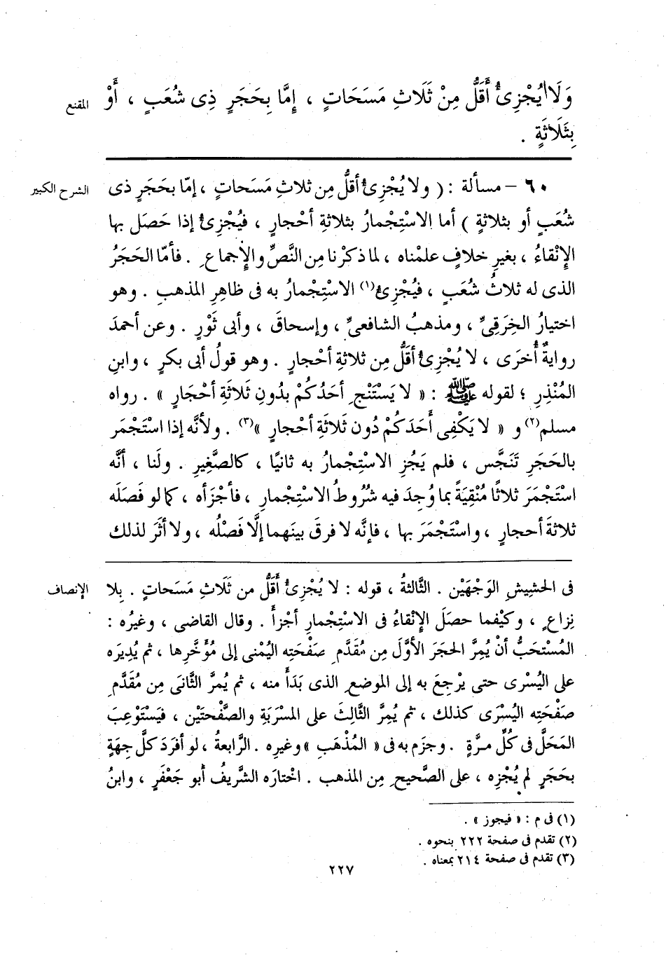 وَلَا يُجْزِيء أَقَلُّ مِنْ ثَلَاثِ مَسَحَاتٍ، إِمَّا بِحَجَرٍ ذِى شُعَبٍ، أَوْ بِثَلَاثَةٍ.