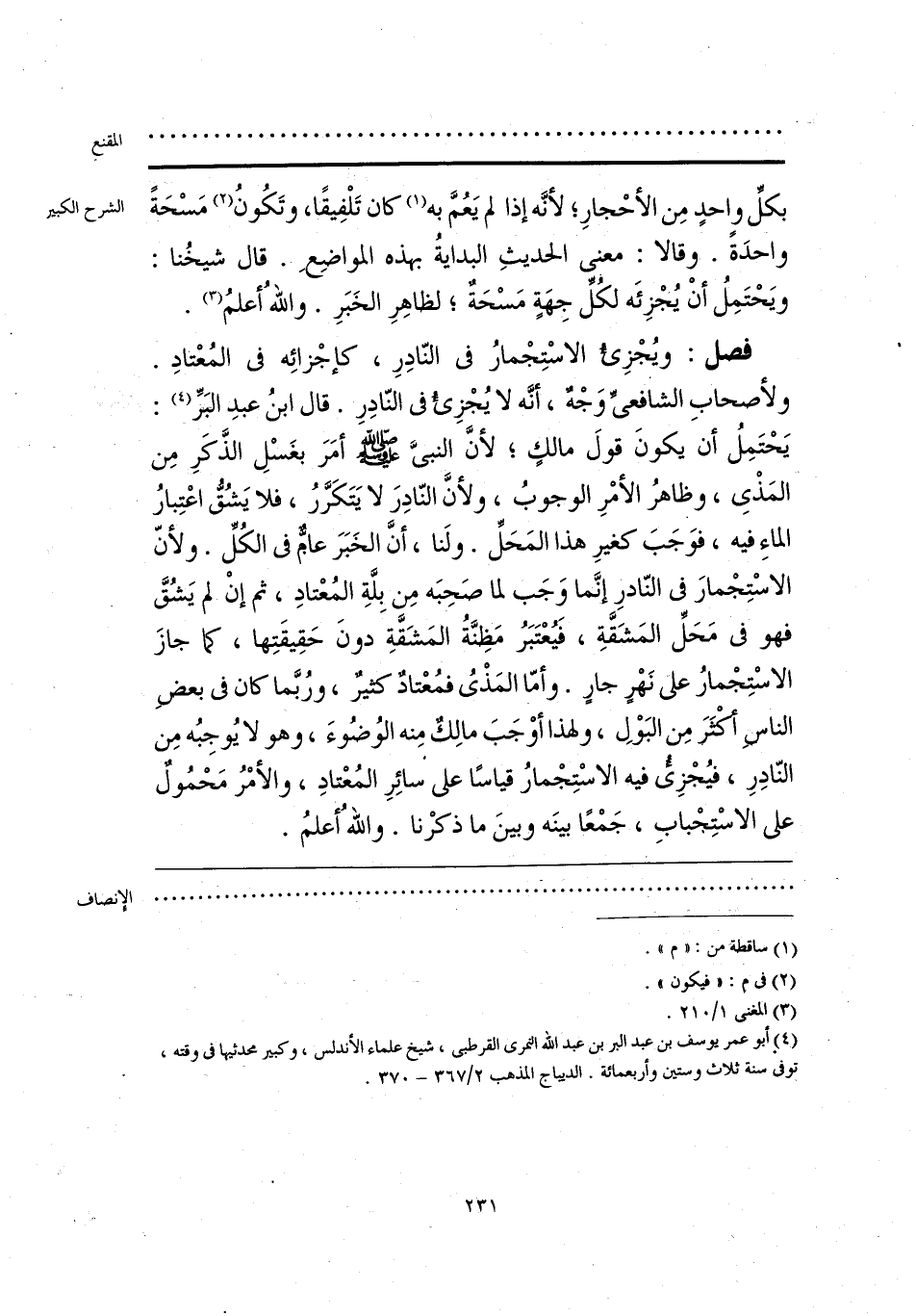 ولأصحابِ الشافعيِّ وَجْه، أنَّه لا يُجْزِئُ في النّادِرِ. قال ابنُ عبدِ البَرِّ (¬4): يَحْتَمِلُ أن يكونَ قولَ مالكٍ؛ لأنَّ النبيَّ - صلى الله عليه وسلم - أمَرَ بغَسْلِ الذَّكَرِ مِن المَذْىِ، وظاهرُ الأمْرِ الوجوبُ، ولأنَّ النّادِرَ لا يَتَكَرَّرُ، فلا يَشُقُّ اعْتِبارُ الماءِ فيه، فوَجَبَ كغيرِ هذا المَحَلِّ. ولَنا، أنَّ الخَبَرَ عام في الكُلِّ. ولأنّ الاسْتِجْمارَ في النّادرِ إنَّما وَجَب لما صَحِبَه مِن بِلَّةِ المُعْتادِ، ثم إنْ لم يَشُقَّ فهو في مَحَلِّ المَشَقَّةِ، فيُعْتَبَرُ مَظِنَّةُ المَشَقَّةِ دونَ حَقِيقَتِها، كما جازَ الاسْتِجْمارُ على نَهْرٍ جارٍ. وأمّا المَذْىُ فمُعْتادٌ كثيرٌ، ورُبَّما كان في بعض النَّاسِ أكثرَ مِن البَوْلِ، ولهذا أوْجَبَ مالِكٌ مِنه الوُضُوءَ، وهو لا يُوجِبُه مِن النّادِرِ، فيُجْزِئ فيه الاسْتِجْمارُ قياسًا على سائِرِ المُعْتادِ، والأمْرُ مَحْمُولٌ على الاسْتِجْبابِ، جَمْعًا بينَه وبينَ ما ذكرْنا. واللهُ أعلمُ.