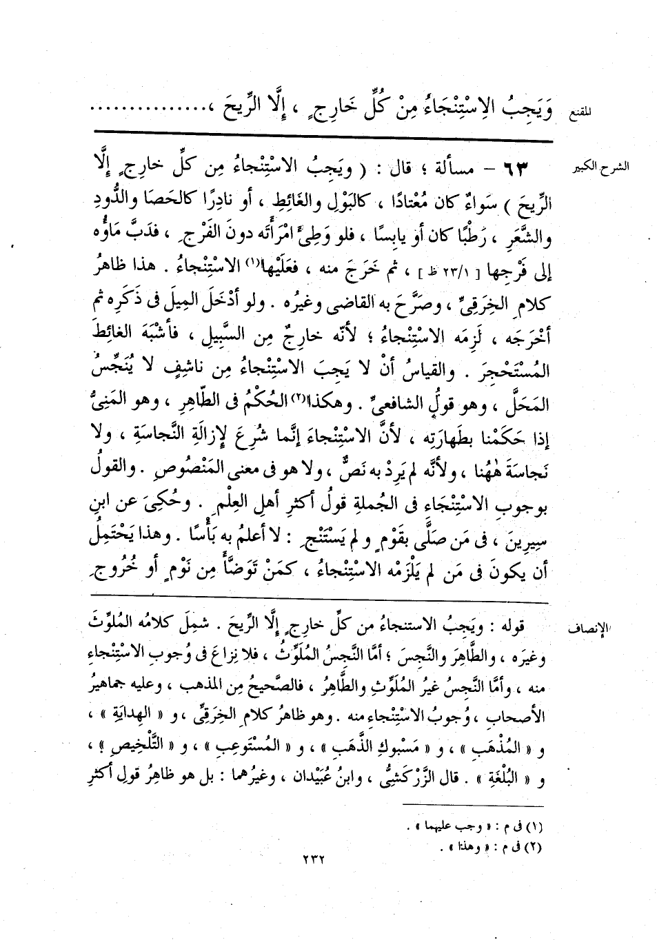قوله: ويَجِبُ الاستنجاءُ من كلِّ خارِج إلَّا الرِّيحَ. شملَ كلامُه المُلوِّثَ وغيرَه، والطَّاهِرَ والنَّجِسَ؛ أمَّا النَّجس المُلَوثُ، فلا نِزاعَ في وُجوبِ الاسْتِنْجاءِ منه، وأمَّا النَّجِس غيرُ المُلَوِّثِ والطَّاهِرُ، فالصَّحيحُ مِن المذهب، وعليه جماهيرُ الأصحابِ، وُجوبُ الاستِنْجاءِ منه. وهو ظاهرُ كلامِ الخِرَقِيِّ، و «الهِداية»، و «المُذْهَبِ»، و «مَسْبوكِ الذَّهَبِ»، و «المُسْتَوعِبِ»، و «التَّلْخِيص»، و «البُلْغَةِ». قال الزَّرْكَشِيُّ، وابنُ عُبَيدان، وغيرُهما: بل هو ظاهِرُ قولِ أكثرِ