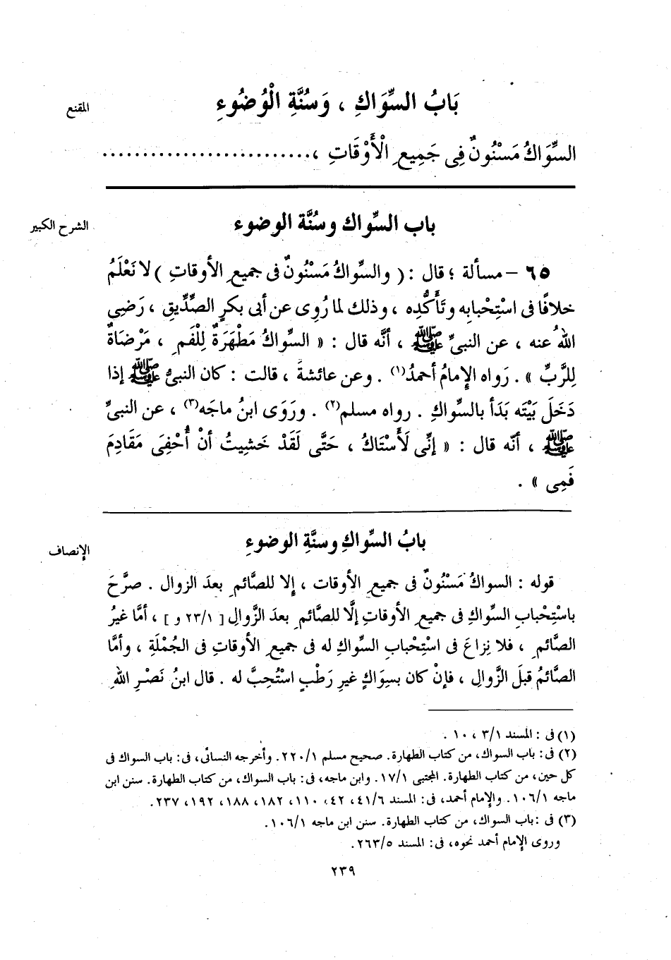 قوله: السواكُ مَسْنُونٌ في جميع الأوقات، إلا للصَّائمِ بعدَ الزوال. صرَّحَ باستحْبابِ السِّواكِ في جميع الأوقاتِ إلَّا للصَّائمِ بعدَ الزوالِ، أمَّا غيرُ الصَّائمِ، فلا نِزاعَ في اسْتِحْبابِ السِّواكِ له في جميع الأوقاتِ في الجُمْلَةِ، وأمَّا الصَّائمُ قبلَ الزَّوالِ، فإنْ كان بسِوَاكٍ غيرِ رَطْبٍ اسْتُحِبَّ له. قال ابنُ نَصْرِ الله
