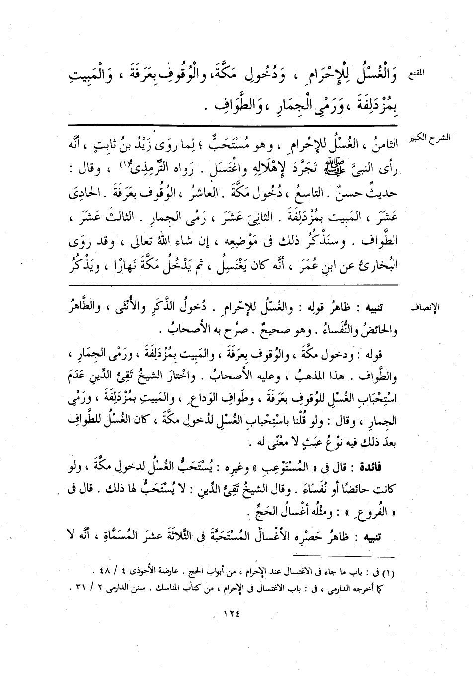 قوله: ودخول مكَّةَ، والوُقوف بِعرَفَةَ، والمَبِيت بِمُزْدَلِفَةَ، ورَمْي الجِمَارِ، والطواف. هذا المذهبُ، وعليه الأصحابُ. واخْتارَ الشيخُ تَقِيُّ الدِّينِ عَدَمَ اسْتِحْبَابِ الغُسْلِ للوُقوفِ بعَرَفَةَ، وطَوافِ الوَداعِ، والمَبيتِ بمُزْدَلِفَةَ، ورَمْي الجِمارِ، وقال: ولو قُلْنا باسْتِحْبابِ الغُسْلِ لدُخولِ مكَّةَ، كان الغُسْلُ للطوافِ بعدَ ذلك فيه نوْعُ عبَثٍ لا معْنى له.