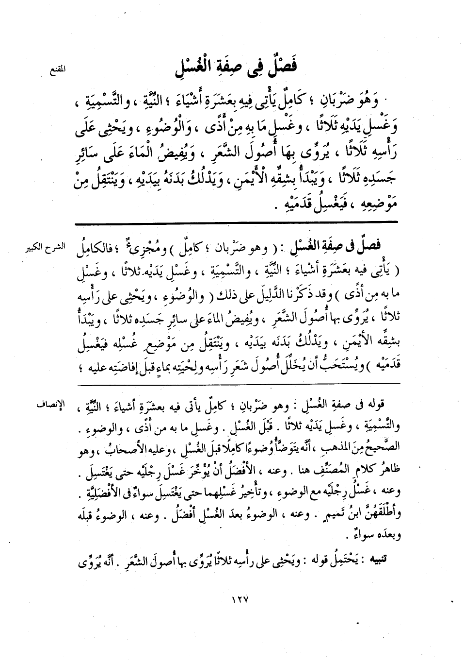 وَهُوَ ضَرْبَانِ؛ كَامِلٌ يأتي فِيهِ بِعَشرةِ أشيَاءَ، النيةِ، والتسمِيَةِ، وَغَسْل يَدَيه ثَلَاثًا، وغَسْلِ مَا بِهِ مِنْ أذى، وَالْوُضُوءِ، ويَحْثِي عَلَى رَأسِهِ ثَلَاثًا، يُرَوِّى بِهَا أصُولَ الشَّعَرِ، وَيفيض الْمَاءَ عَلَى سَائِرِ جَسَدِه ثَلاثًا، وَيَبْدَأ بِشِقِّهِ الْأيمَنِ، وَيَدْلُكُ بَدَنَهُ بيَدَيهِ، وَيَنْتَقِلُ مِنْ مَوْضِعِهِ، فَيَغْسِلُ قَدَمَيهِ.