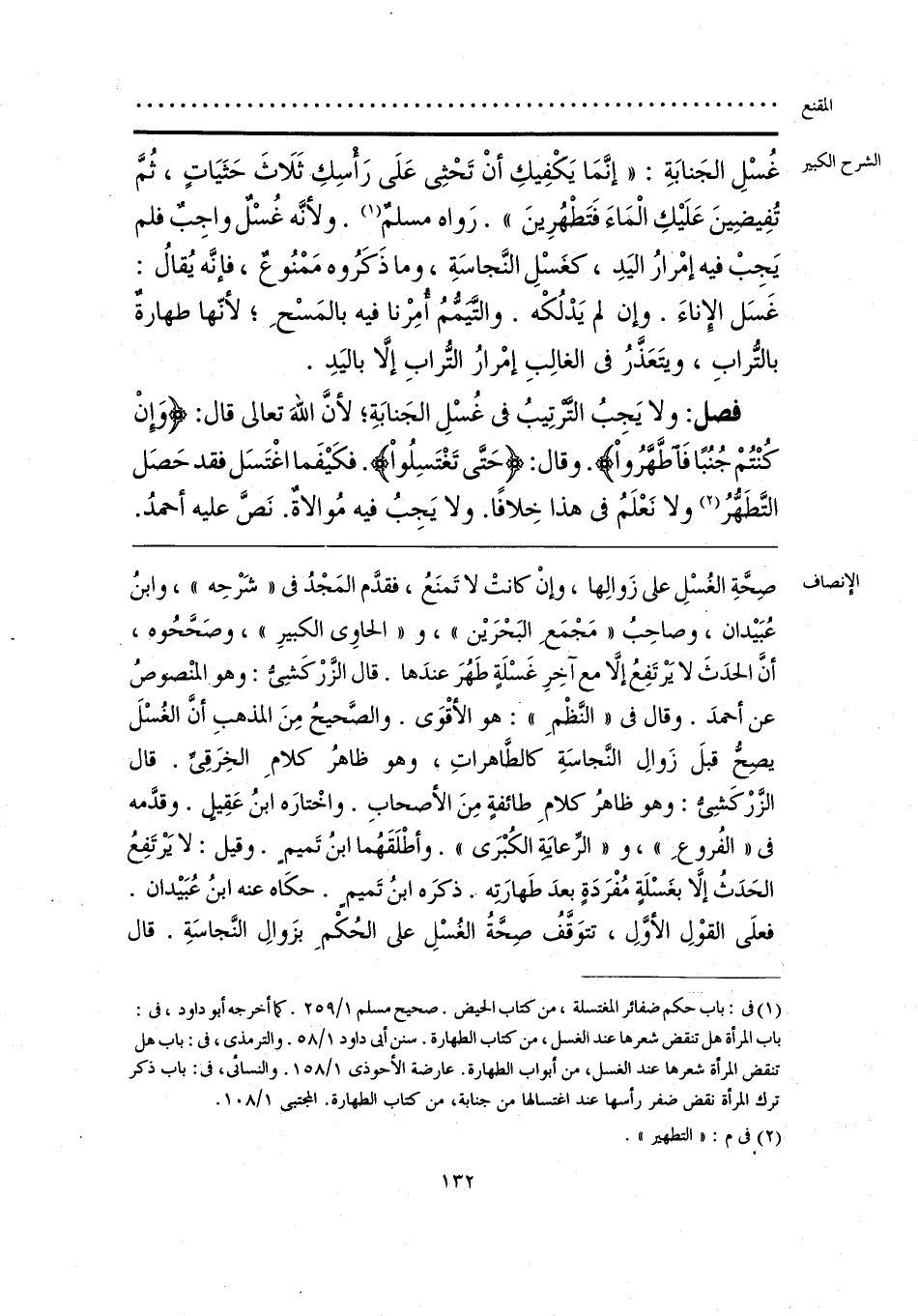 صِحَّةِ الغُسْلِ على زَوالِها، وإنْ كانتْ لا تَمنَعُ، فقدَّم المَجْدُ في «شَرْحِه»، وابنُ عُبَيدان، وصاحِبُ «مَجْمَع البَحْرَين»، و «الحاوي الكبيرِ»، وصَحَّحُوه، أنَّ الحدَثَ لا يَرْتَفِعُ إلَّا مع آخِرِ غَسْلَةٍ طَهُرَ عندَها. قال الزَّرْكَشِيُّ: وهو المنْصوصُ عن أحمدَ. وقال في «النَّظْمِ»: هو الأقْوَى. والصَّحيحُ مِنَ المذهبِ أنَّ الغُسْلَ يصِحُّ قبلَ زَوالِ النَّجاسَةِ كالطَّاهراتِ، وهو ظاهرُ كلامِ الخِرَقي. قال الزَّرْكَشِيُّ: وهو ظاهرُ كلاءِ طائفةٍ مِنَ الأصحابِ. واختاره ابنُ عَقِيل. وقدَّمه في «الفُروعِ»، و «الرِّعاية الكُبْرَى». وأطْلَقَهُما ابنُ تَميم. وقيل: لا يَرْتَفِعُ الحَدَثُ إلَّا بغَسْلَةٍ مُفْرَدَةٍ بعدَ طَهارَته. ذكره ابنُ تَميم. حكَاه عنه ابنُ عُبَيدان. فعلَى القوْلِ الأوَّلِ، تتوَقَّفُ صِحَّةُ الغُسْلِ على الحُكْمِ بزَوالِ النَّجاسَةِ. قال
