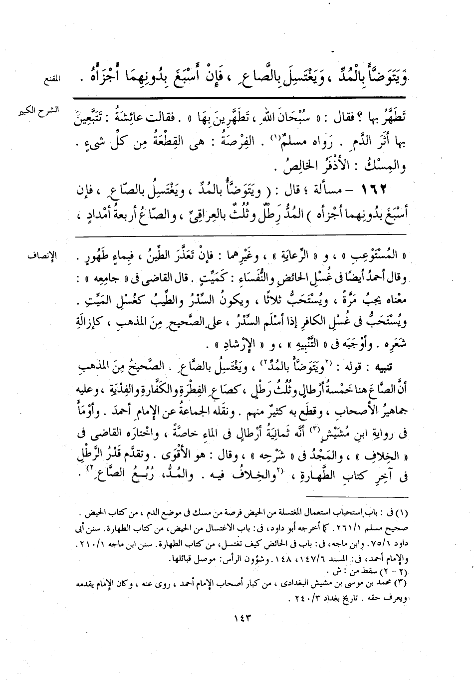 تنبيه: قوله: [ويَتَوَضَّأ بالمُدِّ] (¬1)، ويَغْتَسِلُ بالصَّاعِ. الصَّحيح مِنَ المذهبِ أنَّ الصَّاعَ هنا خَمْسةُ أرْطالٍ وثُلُثُ رَطْلٍ، كصَاعِ الفِطرةِ والكَفَّارةِ والفِدْيَة، وعليه جماهيرُ الأصحابِ، وقطَع به كثير منهم. ونقَله الجماعةُ عن الإِمامِ أحمدَ. وأوْمَأ في رواية ابنِ مُشَيشٍ (¬2) أنَّه ثَمانِيَةُ أرْطالٍ في الماءِ خاصةً، واخْتارَه القاضي في «الخِلافِ»، والمَجْدُ في «شَرْحِه»، وقال: هو الأقْوَى. وتقدَّم قَدْرُ الرَّطْلِ في آخِرِ كتابِ الطهارةِ، [والخِلافُ فيه. والمُدُّ، رُبُعُ الصَّاعِ] (2).