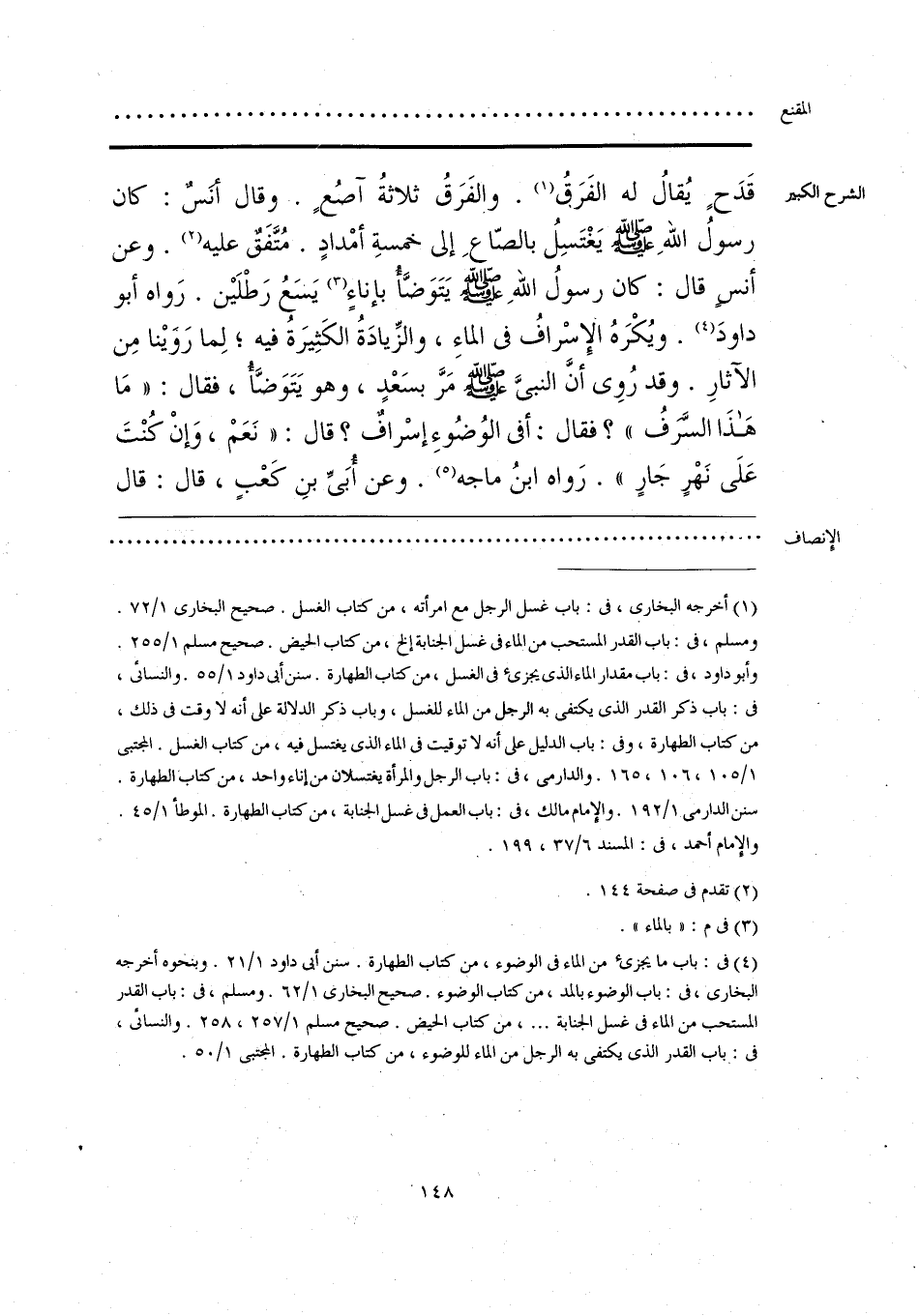 قَدَحٍ يُقالُ له الفَرَق (¬1). والفَرَقُ ثلاثةُ آصُعٍ. وقال أنسٌ: كان رسولُ الله - صلى الله عليه وسلم - يَغْتَسِلُ بالصّاعِ إلى خمسةِ أمْدادٍ. مُتَّفَقٌ عليه (¬2). وعن أنس قال: كان رسولُ الله - صلى الله عليه وسلم - يَتَوَضَّأ بإناءٍ (¬3) يَسَعُ رَطْلَين. رَواه أبو داودَ (¬4). ويكره الإِسْرافُ في الماءِ، والزِّيادَةُ الكَثيرَةُ فيه؛ لِما رَوينا مِن الآثارِ. وقد رُوِيَ أنَّ النبيَّ - صلى الله عليه وسلم - مَرَّ بسَعْدٍ، وهو يَتَوَضَّأ، فقال: «مَا هَذَا السَّرَفُ»؟ فقال: أفي الوُضُوءِ إسْرافٌ؟ قال: «نَعَمْ، وَإنْ كُنْتَ عَلَى نَهْرٍ جَارٍ». رَواه ابنُ ماجه (¬5). وعن أُبَيِّ بنِ كَعْبٍ، قال: قال