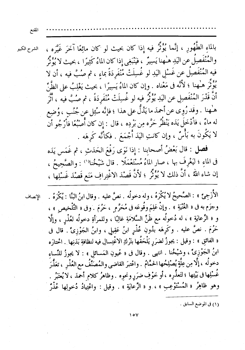 الأَزَجِيِّ»: الصَّحيحُ لا يُكْرَهُ، وله دخولُه. نصَّ عليه. وقال ابنُ البَنَّا: يُكْرَهُ. وجزَم به في «الغُنْيَةِ». وإنْ عَلِمَ وقُوعَه في مُحَرَّم، حَرُمَ. وفي «التَّلْخيصِ»، و «الرِّعايَةِ»، له دُخولُه مع ظَنِّ السَّلامَةِ غالِبًا، وللمرأةِ دخولُه لعُذْرٍ، وإلَّا حَرُمَ. نصَّ عليه. وكَرِهَه بدُونِ عُذْرٍ ابنُ عَقِيلٍ، وابنُ الجَوْزِيِّ. قال في «الفائقِ»: وقيل: يجوزُ لضرَرٍ يَلْحَقُها بتَرْكِ الاغْتِسالِ فيه لنظافةِ بَدَنِها. اخْتارَه ابنُ الجَوْزِيِّ، وشيخُنا. انتهى. وقال في «عُيونِ المَسائلِ»: لا يجوزُ للنِّساءِ دخولُه، إلَّا مِن عِلَّةٍ يُصْلِحُها الحمَّامُ. واعْتبرَ القاضي والمُصَنِّفُ مع العُذْرِ، تعَذُّرَ غُسْلِها في بَيتِها؛ لتَعذُّرِه، أو خَوْفِ ضرَرٍ ونحوه. وظاهرُ كلامِ أحمدَ، لا يُعتَبَرُ. وهو ظاهِرُ «المُسْتَوْعِبِ»، و «الرِّعايَةِ». وقيل: واعْتِيادُ دُخولِها عُذْرٌ