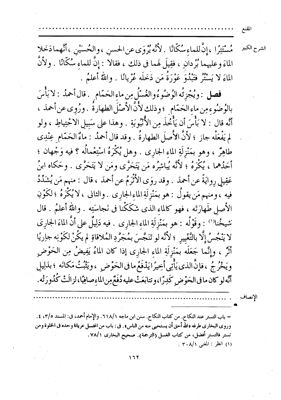 فصل: ويُجْزِئُه الوُضُوءُ والغُسْلُ مِن ماءِ الحَمّامِ. قال أحمدُ: لا بَأْسَ بالوُضُوءِ مِن ماءِ الحَمّام؛ وذلك لأنَّ الأصْلَ الطهارةُ. ورُوي عن أحمدَ، أنَّه قال: لا بَأْسَ أن يَأخُذَ مِن الأُنْبُوبَةِ. وهذا على سَبِيلِ الاحْتِياطِ، ولو لم يَفْعَلْه جاز؛ لأنَّ الأَصلَ الطهارةُ. وقد قال أحمدُ: ماءٌ الحَمّامِ عِنْدِي طاهِرٌ، وهو بمَنْزِلَةِ الماءِ الجارِي. وهل يُكْرَهُ اسْتِعْمالُه؟ فيه وَجْهان؛ أحَدُهما، يُكْرَهُ، لأنَّه يُباشِرُه مَن يَتَحَرَّى ومَن لا يَتَحَرَّى. وحَكاه ابنُ عَقِيلٍ رِوايَةً عن أحمدَ. وقد روَى الأثْرَمُ عن أحمدَ، قال: منهم مَن يُشَدِّدُ فيه، ومنهم مَن يقولُ: هو بمَنْزِلَةِ الماءِ الجارِي. والثاني، لا يُكْرَهُ؛ لكَوْنِ الأصلِ طَهارَتَه، فهو كالماءِ الذي شَكَكْنا في نَجاسَتِه. واللهُ أعلمُ. قال شيخُنا (¬1): وقَوْلُه: هو بمَنْزِلَةِ الماءِ الجارِي. فيه دَلِيلٌ على أنَّ الماءَ الجارِيَ لا يَنْجُسُ إلا بالتَّغْيِيرِ؛ لأنَّه لو تَنَجَّسَ بمُجَرَّدِ المُلاقاةِ لم يكُنْ لكَوْنِه جاريًا أثَرٌ، وإنَّما جَعَلَه بمَنْزِلَةِ الماءِ الجارِي إذا كان الماءُ لفيضُ مِن الحَوْضِ ويَخْرُجُ، فإنَّ الذي يَأْتِي أخِيرًا يَدْفَعُ ما في الحَوْضِ، ويَثْبُتُ مَكانَه؛ بدَلِيلِ أنَّه لو كان ما في الحَوْضِ كَدِرًا، وتتابَعَتْ عليه دُفَعٌ مِن الماءِ صافِيًا، لزالتْ كُدُورَتُه.