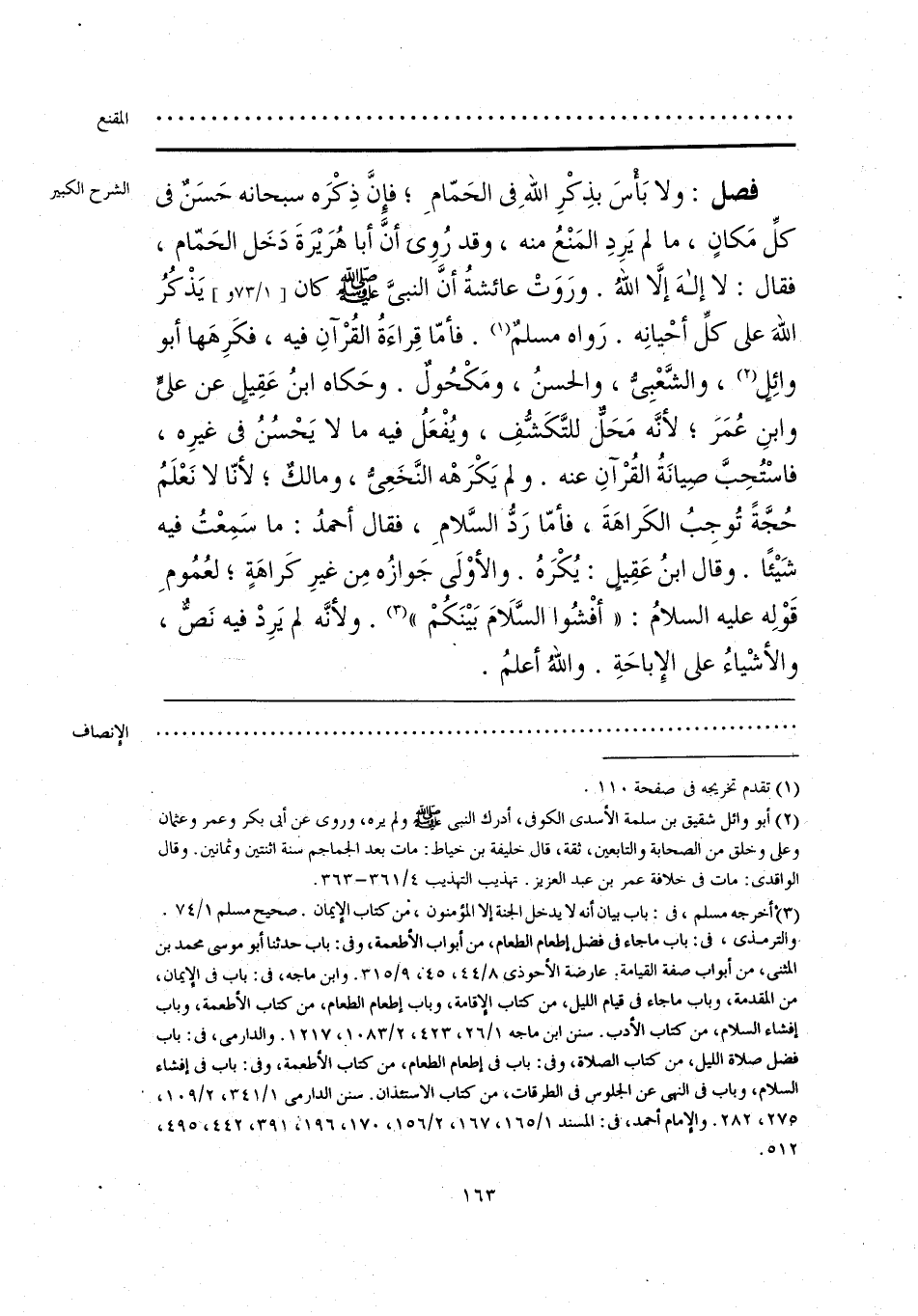 فصل: ولا بَأْسَ بذِكْرِ اللهِ في الحَمّامِ؛ فإنَّ ذِكْرَه سبحانه حَسَنٌ في كلِّ مَكانٍ، ما لم يَرِدِ المَنْعُ منه، وقد رُوِيَ أنَّ أبا هُرَيرَةَ دَخَل الحَمّام، فقال: لا إلهَ إلَّا اللهُ. ورَوَتْ عائشةُ أنَّ النبيَّ - صلى الله عليه وسلم - كان يَذْكُرُ اللهَ على كلِّ أحْيانِه. رَواه مسلمٌ (¬1). فأمّا قِراءَةُ القُرْآنِ فيه، فكَرِهَها أبو وائِلٍ (¬2)، والشَّعْبِيُّ، والحسنُ، ومَكْحُولٌ. وحَكاه ابنُ عَقِيلٍ عن عليٍّ وابنِ عُمَرَ؛ لأنَّه مَحَلٌّ للتَّكَشُّفِ، ويُفْعَلُ فيه ما لا يَحْسُنُ في غيرِه، فاسْتُحِبَّ صِيانَةُ القُرْآنِ عنه. ولم يَكْرَهْه النَّخَعِيُّ، ومالكٌ، لأنّا لا نَعْلَمُ حُجَّةً تُوجِبُ الكَراهَةَ، فأمّا رَدُّ السَّلامِ، فقال أحمدُ: ما سَمِعْتُ فيه شَيئًا. وقال ابنُ عَقِيلٍ: يُكْرَهُ. والأوْلَى جَوازُه مِن غيرِ كَراهَةٍ؛ لعُمُومِ قَوْلِه - عليه السلام -: «أفْشُوا السَّلَامَ بَينَكُمْ» (¬3). ولأنَّه لم يَرِدْ فيه نَصٌّ، والأشْياءُ على الإِباحَةِ. واللهُ أعلمُ.