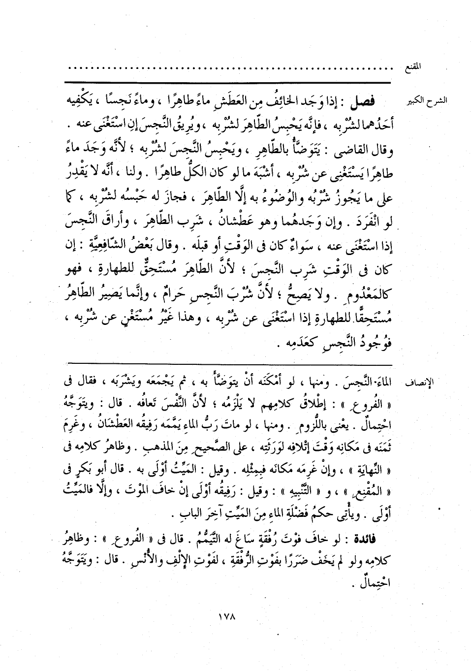 الماءَ النَّجِسَ. ومنها، لو أمْكَنَه أنْ يتوَضَّأَ به، ثم يَجْمَعَه ويَشْرَبَه، فقال في «الفُروعِ»: إطْلاقُ كلامِهم لا يَلْزَمُه؛ لأنَّ النَّفْسَ تَعافُه. قال: ويتَوَجَّهُ احْتِمالٌ. يعْني باللُّزومِ. ومنها، لو ماتَ رَبُّ الماءِ يَمَّمَه رَفِيقُه العَطْشَانُ، وغَرِمَ ثَمَنَه في مَكانِه وَقْتَ إتْلافِه لوَرَثَتِه، على الصَّحيحِ مِنَ المذهبِ. وظاهرُ كلامِه في «النِّهايَةِ»، وإنْ غَرِمَه مَكانَه فبِمِثْلِه. وقيل: المَيِّتُ أوْلَى به. قال أبو بَكرٍ في «المُقْنِع»، و «التَّنْبِيهِ»: وقيل: رَفِيقُه أوْلَى إنْ خافَ الموْتَ، وإلَّا فالمَيِّتُ أوْلَى. ويأْتِي حكمُ فَضْلَةِ الماءِ مِنَ المَيِّتِ آخِرَ البابِ.