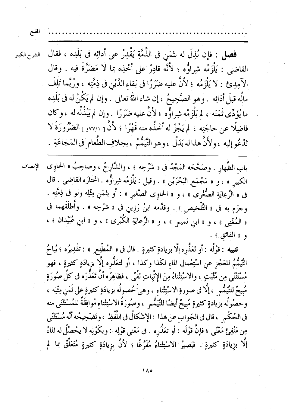 تنبيه: قوْلُه: أو تَعَذُّرِه إلَّا بزيادةٍ كثيرةٍ. قال في «المُطْلِع»: تقْدِيرُه؛ يُباحُ التَّيَمُّمُ للعَجْزِ عنِ اسْتِعْمالِ الماءِ لكَذا وكذا، أو لتعَذُّرِه إلَّا بزِيادَةٍ كثيرةٍ، فهو مُسْتَثْنًى مِن مُثْبَتٍ، والاسْتِثْناءُ مِنَ الإِثْباتِ نَفْيٌ، فظاهِرُه أنَّ تَعَذُّرَه في كلِّ صُورَةٍ مُبِيحٌ للتَّيَمُّمِ، إلَّا في صورةِ الاسْتِثْناءِ، وهي حُصولُه بزيادَةٍ كثيرةٍ على ثَمَنِ مِثْلِه، وحصُولُه بزيادةٍ كثيرةٍ مُبِيحٌ أيضًا للتَّيَمُّمِ، وصُورَةُ الاسْتِثْناءِ مُوافِقَةٌ للمُسْتَثْنَى منه في الحُكْمِ، قال في الجَوابِ عن هذا: الإِشْكالُ في اللَّفْظِ، وتَصْحِيحُه أنَّه مُسْتَثْنًى مِن مَنْفِيٍّ مَعْنًى؛ فإنَّ قوْلَه: أو تعَذُّرِه. في مَعْنى قوْلِه: وبكَوْنِه لا يحْصُلُ له الماءُ إلَّا بزِيادَةٍ كثيرةٍ. فيَصيرُ الاسْتِثْناءُ مُفَرَّغًا؛ لأنَّ بِزِيادَةٍ كثيرةٍ مُتَعَلِّق بما لم