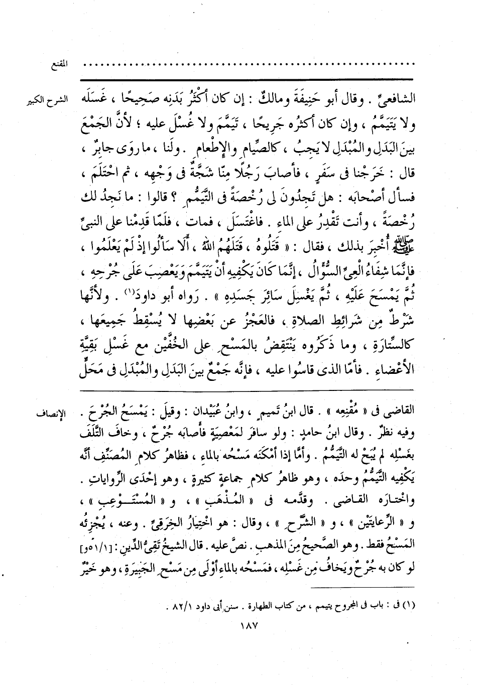 القاضي في «مُقْنِعِه». قال ابنُ تَميم، وابنُ عُبَيدان: وقيلَ: يَمْسَحُ الجُرْحَ. وفيه نظرٌ. وقال ابنُ حامدٍ: ولو سافرَ لمَعْصِيَةٍ فأصابَه جُرْحٌ، وخافَ التَّلَفَ بغَسْلِه لم يُبَحْ له التَّيَمُّمُ. وأمَّا إذا أمْكَنَه مَسْحُهْ بالماءِ، فظاهرُ كلامِ المُصَنِّفِ أنَّه يَكْفِيه التَّيَمُّمُ وحدَه، وهو ظاهرُ كلامِ جماعةٍ كثيرةٍ، وهو إحْدَى الرِّواياتِ. واخْتارَه القاضي. وقدَّمه في «المُذْهَبِ»، و «المُسْتَوْعِبِ»، و «الرِّعايتَين»، و «الشَّرْحِ»، وقال: هو اخْتِيارُ الخِرَقي. وعنه، يُجْزِئُه المَسْح فقط. وهو الصَّحيحُ مِنَ المذهبِ. نصَّ عليه. قال الشيخُ تَقِي الدِّينِ: لو كان به جُرْح ويَخافُ من غَسْلِه، فمَسْحُه بالماءِ أوْلَى مِن مَسْحِ الجَبيرَةِ، وهو خَيرٌ