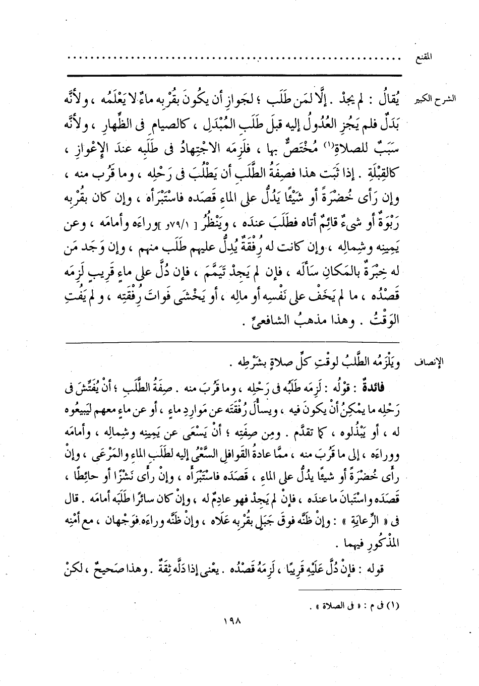 فائدة: قوْلُه: لَزِمَه طَلَبُه في رحْلِه، وما قَرُبَ منه. صِفَةُ الطَّلَبِ، أنْ يُفَتِّشَ في رَحْلِه ما يمْكِنُ أنْ يكونَ فيه، ويسأُلَ رُفْقَتَه عن مَوارِدِ ماءٍ، أو عن ماءٍ معهم ليَبيعُوه له، أو يَبْذُلوه، كما تقدَّم. ومِن صِفَتِه؛ أنْ يَسْعَى عن يَمِينِه وشِمالِه، وأمامَه ووراءَه، إلى ما قَرُبَ منه، ممَّا عادةُ القَوافلِ السَّعْيُ إليه لطَلَب الماءِ والمَرْعَى، وإنْ رأى خُضْرَةً أو شيئًا يدُلُّ على الماءِ، قَصَدَه فاسْتَبْرَأه، وإنْ رَأى نَشْزًا أو حائِطًا، قَصَدَه واسْتَبانَ ما عندَه، فإنْ لم يَجِدْ فهو عادِمٌ له، وإنْ كان سائرًا طَلَبَه أمامَه. قال في «الرِّعايَةِ»: وإنْ ظَنَّه فوقَ جَبَل بقُرْبِه عَلَاه، وإنْ ظَنَّه وراءَه. فوَجْهان، مع أمْنِه المذْكُورِ فيهما.