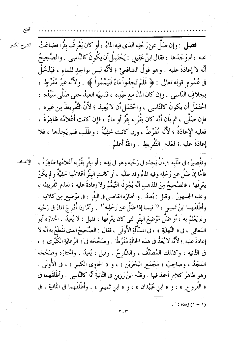 وتقْصيره في طَلَبِه؛ بأنْ يَجِدَه في رَحْلِه وهو في يَدِه، أو ببِئْرٍ بقُرْبِه أعْلامُها ظاهِرَةٌ، فأمَّا إنْ ضَلَّ عن رَحْلِه وفيه، الماءُ وقد طلَبَه، أو كانتِ البِئْرُ أعْلامُها خَفِيَّةٌ ولم يكُنْ يعْرِفُها، فالصَّحيحُ مِنَ المذهبِ أنَّه يُجْزِئُه التَّيَمُّمُ ولا إعادةَ عليه؛ لعدَمِ تَفْريطِه، وعليه الجمهورُ. وقيل: يُعيدُ. واخْتارَه القاضي في البِئْرِ، في موْضِعٍ مِن كلامِه. وأطْلقَهما ابنُ تَميم، [فيما إذا ضَلَّ عن رَحْلِه] (¬1). وأمَّا إذا ادْرِجَ الماءُ في رَحْلِه ولم يَعْلَمْ به، أو ضَلَّ مَوْضِعَ البِئْرِ التي كان يعْرِفُها، فقيل: لا يُعيدُ. اخْتارَه أبو المَعالِي، في «النِّهايَة»، في المسْألَةِ الأولَى، فقال: الصَّحيحُ الذي نقْطَعُ به أنَّه لا إعادةَ عليه؛ لأنّه لا يُعَدُّ في هذه الحالةِ مُفرِّطًا. وصَحَّحَه في «الرِّعاية الكُبْرَى». في الثَّانيةِ، وكذلك المُصَنِّفُ، والشَّارِحُ. وقيل: يُعيدُ. واخْتارَه وصَحَّحَه المَجْدُ، وصاحِبُ «مَجْمَع البَحْرَين»، و «الحاوي الكبيرِ»، في الأُولَى. وهو ظاهرُ كلامِ أحمدَ فيها. وقدَّم ابنُ رَزِين في الثَّانيةِ أنَّه كالنَّاسِي. وأطْلقَهما في «الفُروعِ»، و «ابنِ عُبَيدان»، و «ابنِ تَميمٍ». وأطْلقَهما في الثَّانيةِ، في