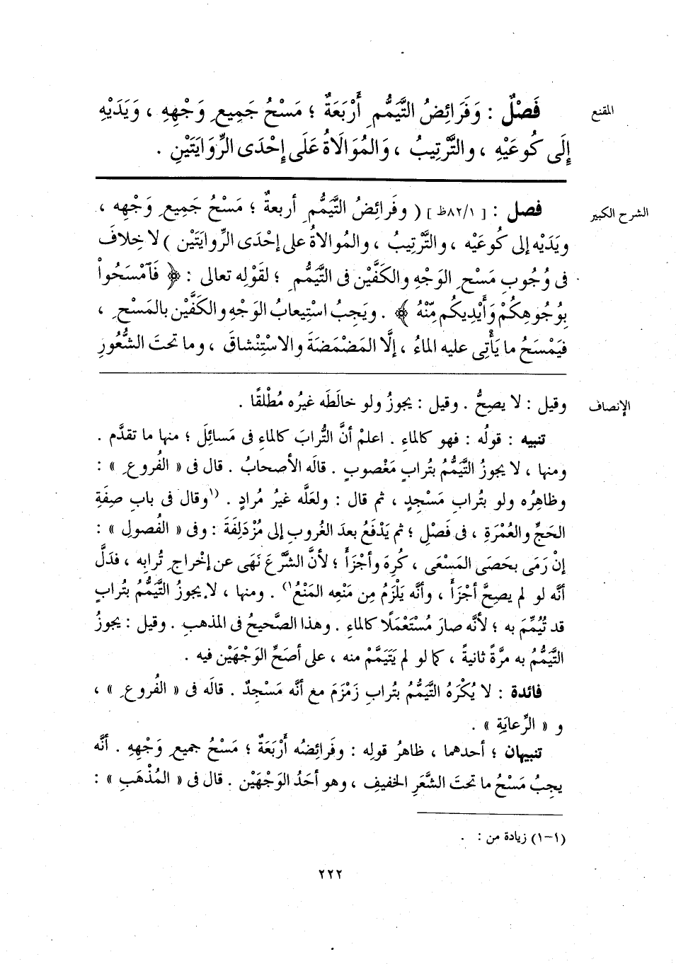 فَصْلٌ: وَفَرَائِضُ التَّيَمُّمِ أرْبَعَةٌ؛ مَسْحُ جَمِيعِ وَجْهِهِ، وَيَدَيهِ إِلَى كُوعَيهِ، والترتِيبُ، وَالمُوَالاةُ عَلَى إِحْدَى الرِّوَايَتَينِ.