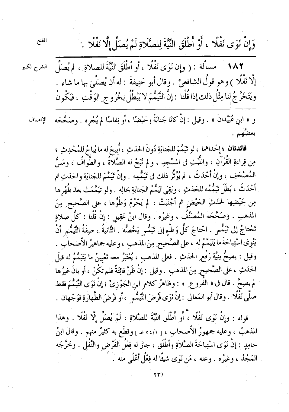و «ابنِ عُبَيدان». وقيل: إنْ كانَا جَنابَةً وحَيضًا، أو نِفاسًا لم يُجْزِه. وصَحَّحَه بعضُهم. فائدتان؛ إِحْداهما، لو تَيَمَّمَ للجَنابَةِ دُونَ الحدَثِ، أبِيحَ له ما يُباحُ للمُحْدِثِ، مِن قِراءةِ القُرْآنِ، واللبثِ في المسْجِدِ، ولم تُبَحْ له الصَّلاةُ، والطوافُ، ومَسُّ المُصْحَفِ، وإنْ أحْدَثَ، لم يُؤثِّرْ ذلك في تَيَمُّمِه. وإنْ تَيَمَّمَ للجَنابَةِ والحدَثِ ثم أحْدَثَ، بَطَلَ تَيَمُّمُه للحَدَثِ، وبَقِيَ تَيَمُّمُ الجَنابَةِ بحالِه. ولو تيَمَّمَتْ بعدَ طُهْرِها مِن حَيضِها لحدَثِ الحَيض ثم أجْنَبَتْ، لم يَحْرُمْ وَطْؤها، على الصَّحيحِ مِنَ المذهبِ. وصَحَّحَه المُصَنِّفُ، وغيرُه. وقال ابنُ عَقِيل: إنْ قُلْنا: كلُّ صلاةٍ تَحْتاجُ إلى تَيَمُّم. احْتاجَ كلُّ وَطْءٍ إلى تَيَمُّمٍ يَخُصُّه. الثَّانيةُ، صِفَةُ التَّيَمُّمِ أنْ يَنْويَ اسْتِباحَةَ ما يَتَيَمَّمُ له، على الصَّحيحِ مِنَ المذهبِ، وعليه جماهيرُ الأصحابِ. وقيل: يصِحُّ بنيَّةِ رَفْعِ الحدَثِ. فعلى المذهبِ، يُعْتَبَرُ معه تَعْيِينُ ما يَتَيَمَّمُ له قبلَ الحدَث، على الصَّحيحِ مِنَ المذهبِ. وقيل: إنْ ظَنَّ فائتةً فلم تكُنْ، أو بان غيرُها لم يصِحَّ. قال في «الفُروعِ»: وظاهرُ كلامِ ابن الجَوْزِيِّ، إنْ نَوَي التَّيَمُّمَ فقط صلَّى نَفْلًا. وقال أبو المَعالي: إنْ نَوَى فَرْضَ التَّيَمُّمِ، أو فرْضَ الطهارَةِ فوَجْهان.
