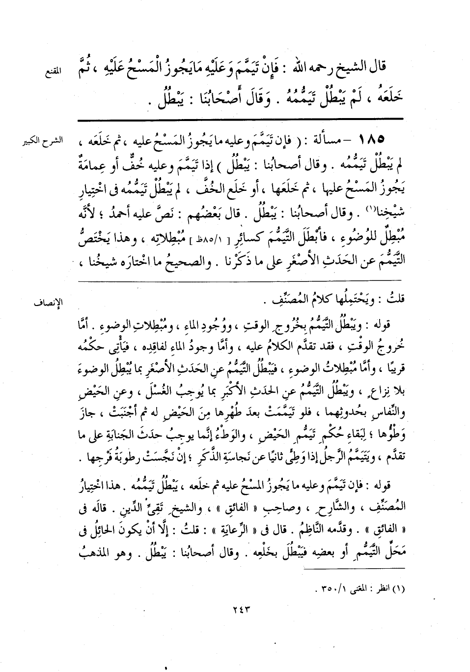 قوله: فإن تَيَمَّمَ وعليه ما يَجُوزُ المسْحُ عليه ثم خلَعه، يَبْطُلُ تَيَمُّمُه. هذا اخْتِيارُ المُصَنِّفِ، والشَّارِحِ، وصاحِبِ «الفائقِ»، والشيخِ تَقِي الدِّينِ. قاله في «الفائقِ». وقدَّمه النَّاظِمُ. قال في «الرِّعاية»: قلتُ: إلَّا أنْ يكونَ الحائِلُ في مَحَلِّ التَّيَمُّمِ أو بعضِه فيَبْطُلَ بخَلْعِه. وقال أصحابُنا: يَبْطُل. وهو المذهبُ