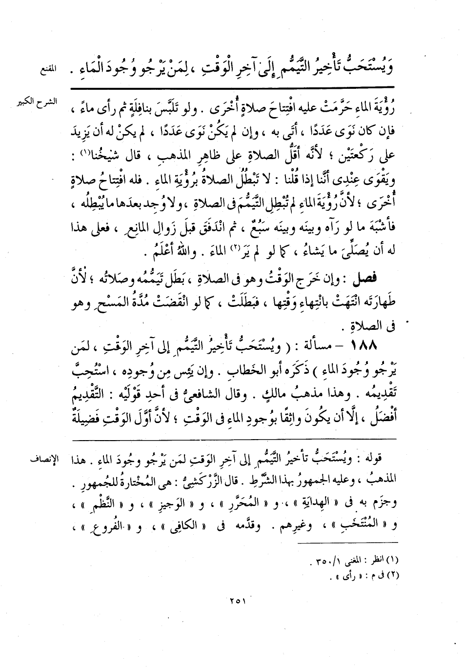 قوله: ويُسْتَحَبُّ تأخيرُ التَّيَمُّمِ إلى آخِرِ الوَقتِ لمَن يَرْجُو وجُودَ الماءِ. هذا المذهبُ، وعليه الجمهورُ بهذا الشَّرْطِ. قال الزَّرْكَشِيُّ: هي المُخْتارةُ للجُمهورِ. وجزَم به في «الهِدايَةِ»، و «المُحَرَّرِ»، و «الوَجيزِ»، و «النَّظْمِ»، و «المُنْتَخبِ»، وغيرِهم. وقدَّمه في «الكافِي»، و «الفُروعِ»،