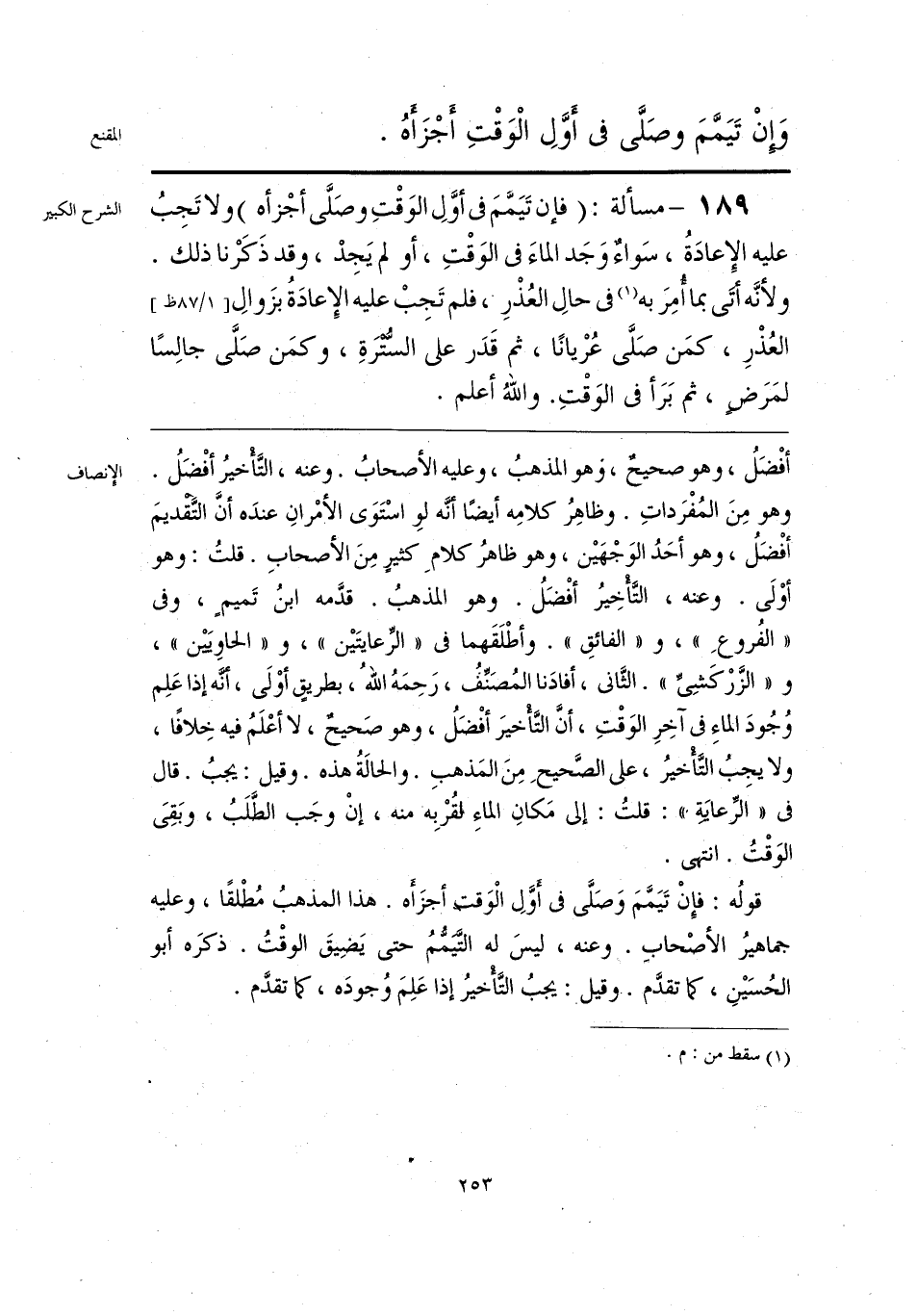 أفْضَلُ، وهو صحيحٌ، وهو المذهبُ، وعليه الأصحابُ. وعنه، التَّأْخيرُ أفْضَلُ. وهو مِنَ المُفْرَداتِ. وظاهِرُ كلامِه أيضًا أنَّه لو اسْتَوَى الأمْرانِ عندَه أنَّ التَّقديمَ أفْضَلُ، وهو أحَدُ الوَجْهَين، وهو ظاهرُ كلامِ كثيرٍ مِنَ الأصحابِ. قلتُ: وهو أوْلَى. وعنه، التَّأْخِيرُ أفْضَلُ. وهو المذهبُ. قدَّمه ابنُ تَميمٍ، وفي «الفُروعِ»، و «الفائقِ». وأطْلَقَهما في «الرِّعايتَين»، و «الحاويَين»، و «الزَّرْكَشِيِّ». الثَّاني، أفادَنا المُصَنِّف، رَحِمَهُ اللهُ، بطريقٍ أوْلَى، أنَّه إذا عَلِم وُجُودَ الماءِ في آخِرِ الوَقْتِ، أنَّ التَّأْخيرَ أفْضَلُ، وهو صَحيحٌ، لا أعْلَمُ فيه خِلافًا، ولا يجِبُ التَّأْخيرُ، على الصَّحيحِ مِنَ المَذهبِ. والحالةُ هذه. وقيل: يجبُ. قال في «الرِّعايَةِ»: قلتُ: إلى مَكانِ الماءِ لقُرْبِه منه، إنْ وجَب الطَّلَبُ، وبَقِيَ الوَقْتُ. انتهى.