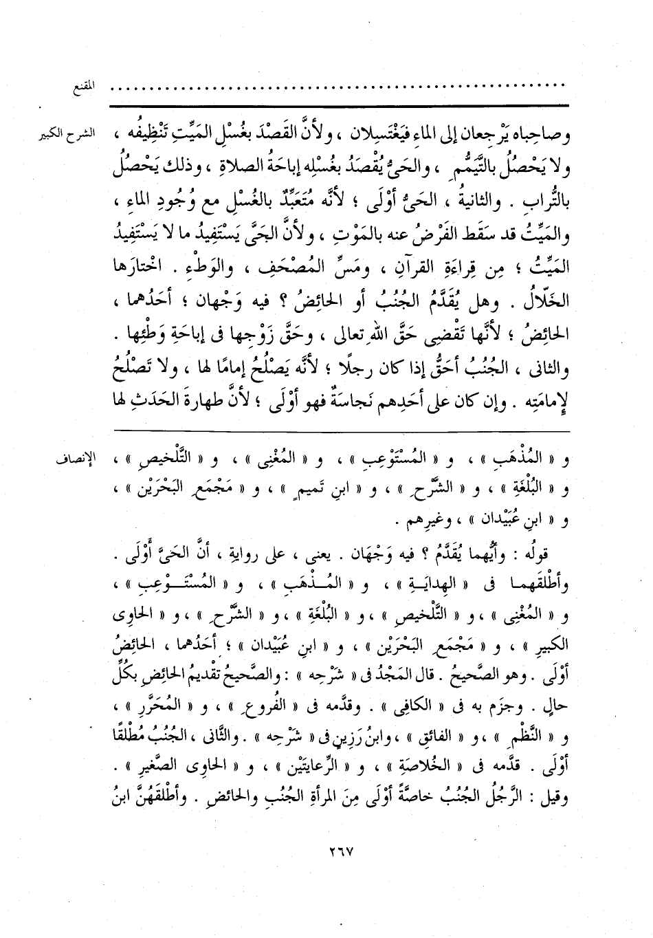 وأطْلقَهما في «الهِدايَةِ»، و «المُذْهَبِ»، و «المُسْتَوْعِبِ»، و «المُغْنِي»، و «التَّلْخيصِ»، و «البُلْغَةِ»، و «الشرحِ»، و «الحاوي الكبيرِ»، و «مَجْمَع البَحْرَين»، و «ابنِ عُبَيدان»؛ أحَدُهما، الحائِضُ أوْلَى. وهو الصَّحيحُ. قال المَجْدُ في «شَرْحِه»: والصَّحيحُ تقْديمُ الحائِضِ بكُلِّ حالٍ. وجزَم به في «الكافِي». وقدَّمه في «الفُروعِ»، و «المُحَرَّرِ»، و «النَّظْمِ»، و «الفائقِ»، وابنُ رَزِينٍ في «شَرْحِه». والثَّاني، الجُنُبُ مُطْلقًا أوْلَى. قدَّمه في «الخُلاصَةِ»، و «الرِّعايتَين»، و «الحاوي الصَّغيرِ». وقيل: الرَّجُلُ الجُنُبُ خاصَّةً أوْلَى مِنَ المرأةِ الجُنُبِ والحائضِ. وأطْلقَهُنَّ ابنُ