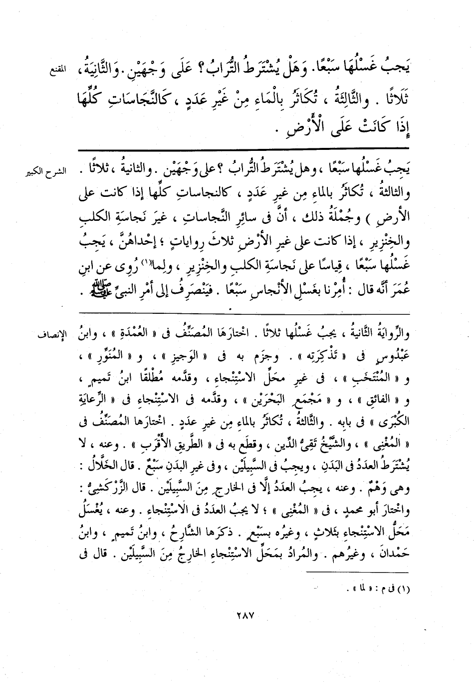 والرِّوايَةُ الثَّانيةُ، يجبُ غَسْلُها ثلاثًا. اخْتارَها المُصَنِّفُ في «العُمدَةِ»، وابنُ عَبْدُوس في «تَذْكِرَتِه». وجزَم به في «الوَجيزِ»، و «المُنَوِّرِ»، و «المُنْتَخَبِ»، في غيرِ محَلِّ الاسْتِنْجاءِ، وقدَّمه مُطْلقًا ابنُ تَميم، و «الفائقِ»، و «مَجْمَع البَحرَين»، وقدَّمه في الاسْتِنْجاءِ في «الرِّعايةِ الكُبْرَى» في بابِه. والثَّالثةُ، تُكاثر بالماءِ مِن غيرِ عدَدٍ. اخْتارَها المُصَنِّفُ في «المُغْنِي»، والشيخُ تَقِيُّ الدِّين، وقطعَ به في «الطرَّيقِ الأقْرَبِ». وعنه، لا يُشْتَرَطُ العدَدُ في البَدَنِ، ويجِبُ في السَّبِيلَين، وفي غيرِ البدَنِ سَبْع. قال الخَلَّالُ: وهي وَهْمٌ. وعنه، يجِبُ العدَدُ إلَّا في الخارجِ مِنَ السَّبِيلَين. قال الزَّركَشِي: واخْتارَ أبو محمدٍ، في «المُغْنِي»؛ لا يجبُ العدَدُ في الاسْتِنْجاءِ. وعنه، يُغْسَلُ مَحَلُّ الاسْتِنْجاءِ بثَلاثٍ، وغيرُه بسَبْعٍ. ذكرَها الشَّارِحُ، وابنُ تَميم، وابنُ حَمدانَ، وغيرُهم. والمُرادُ بمَحَلِّ الاسْتِنْجاءِ الخارِجُ مِنَ السَّبِيلَين. قال في