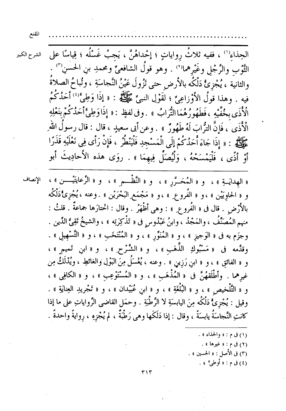 «الهِدايَةِ»، و «المُحَرَّرِ»، و «النَّظْمِ»، و «الرِّعايتَين»، و «الحاويَين»، و «الفُروعِ»، و «مَجْمَعِ البَحْرَين». وعنه، يُجْزِئُ دَلْكُه بالأرْضِ. قال في «الفُروعِ»: وهي أظْهَرُ. وقال: اخْتارَها جماعةٌ. قلتُ: منهم المُصَنِّفُ، والمَجْدُ، وابنُ عَبْدُوسٍ في «تَذْكِرَتِه»، والشيخُ تَقِيُّ الدِّين. وجزَم به في «الوَجيزِ»، و «المُنَوِّرِ»، و «المُنْتَخَبِ»، و «التَّسْهِيلِ». وقدَّمه في «مَسْبُوكِ الذَّهَبِ»، و «الشَّرْحِ»، و «ابنِ تَميمٍ»، و «الفائقِ»، و «ابنِ رَزِين». وعنه، يُغْسَلُ مِنَ البَوْلِ والغائطِ، ويُدْلَكُ مِن غيرِهما. وأطْلَقهُنَّ في «المُذْهَبِ»، و «المُسْتَوْعِبِ»، و «الكافِي»، و «التَّلْخيصِ»، و «البُلْغَةِ»، و «ابنِ عُبَيدان»، و «تَجْريدِ العِنايَةِ». وقيل: يُجْزِئُ دَلْكُه مِنَ اليابسَةِ لا الرَّطْبَةِ. وحمَل القاضي الرِّواياتِ على ما إذا كانتِ النَّجاسَةُ يابسَةً، وقال: إذا دَلَكَها وهي رَطْبَةٌ، لم يُجْزِهِ، رِوايةً واحدةً.