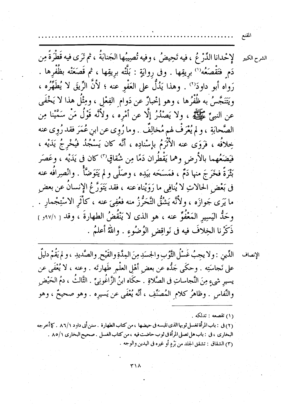 الدِّينِ: ولا يجِبُ غَسْلُ الثَّوْبِ والجسَدِ مِنَ المِدَّةِ والقَيحِ والصَّديدِ، ولم يَقُمْ دليلٌ على نَجاسَتِه. وحكَى جَدُّه عن بعضِ أهْلِ العلْمِ طَهارتَه. وعنه، لا يُعْفَى عن يسيرِ شيءٍ مِنَ النَّجاساتِ في الصَّلاةِ. حكَاه ابنُ الزَّاغُونِيِّ. الثَّالثُ، دمُ الحَيضِ والنِّفاسِ. وظاهرُ كلامِ المُصَنِّفِ، أنَّه يُعْفَى عن يَسيرِه. وهو صحيحٌ، وهو