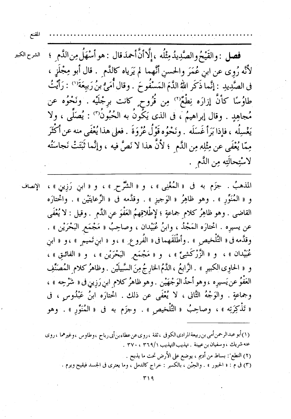 المذهبُ. جزَم به في «المُغْنِي»، و «الشَّرْحِ»، و «ابنِ رَزِين»، و «المُنَوِّرِ». وهو ظاهِرُ «الوَجيزِ». وقدَّمه في «الرِّعايتَين». واخْتارَه القاضي. وهو ظاهِرُ كلامِ جماعةٍ؛ لإِطْلاقِهمُ العَفْوَ عنِ الدَّمِ. وقيل: لا يُعْفَى عن يسيرِه. اخْتارَه المَجْدُ، وابنُ عُبَيدان، وصاحِبُ «مَجْمَعِ البَحْرَين». وقدَّمه في «التَّلْخيصِ». وأطْلَقَهما في «الفُروعِ»، و «ابنِ تَميمٍ»، و «ابنِ عُبَيدان»، و «الزَّرْكَشِيِّ»، و «مَجْمَعِ البَحْرَين»، و «الفائقِ»، و «الحاوي الكبيرِ». الرَّابعُ، الدَّمُ الخارِجُ مِنَ السَّبيلَين. وظاهرُ كلامِ المُصَنِّفِ العَفْوُ عن يَسيرِه،. وهو أحدُ الوَجْهَينِ. وهو ظاهرُ كلامِ ابنِ رَزِينٍ في «شَرْحِه»، وجماعةٍ. والوَجْهُ الثَّاني، لا يُعْفَى عن ذلك. اخْتارَه ابنُ عَبْدُوسٍ، في «تَذْكِرَتِه»، وصاحِبُ «التَّلْخيصِ». وجزَم به في «المُنَوِّرِ». وهو