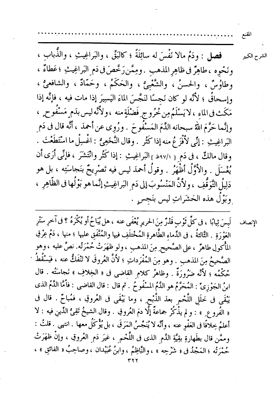 لَبِسَ ثِيابًا، في كلِّ ثَوْب قَدْرٌ مِنَ الحريرِ يُعْفَى عنه، هل يُبَاحُ أو يُكْرَهُ؟ في آخرِ سَتْرِ العَوْرَةِ. الثَّالثةُ، في الدِّماءِ الطَّاهرةِ المُخْتلَفِ فيها والمُتَّفَقِ عليها؛ منها، دَمُ عِرْقِ المأْكولِ طاهرٌ، على الصَّحيحِ مِنَ المذهبِ، ولو ظهَرَتْ حُمْرَتُه. نصَّ عليه، وهو الصَّحيحُ مِنَ المذهبِ. وهو مِنَ المُفْرَداتِ؛ لأنَّ العُروقَ لا تَنْفَكُّ عنه، فيَسْقُطُ حُكْمُه؛ لأنَّه ضَرُورَةٌ. وظاهرُ كلامِ القاضي في «الخِلافِ» نَجاسَتُه. قال ابنُ الجَوْزِيِّ: المُحَرَّمُ هو الدَّمُ المسْفُوحُ. ثم قال: قال القاضي: فأمَّا الدَّمُ الذي يَبْقَى في خَلَلِ اللَّحْمِ بعدَ الذَّبْحِ، وما يَبْقَى في العُروقِ، فمُباحٌ. قال في «الفُروعِ»: ولم يذْكُرْ جماعةٌ إلَّا دمَ العُروقِ. وقال الشيخُ تَقِيُّ الدِّينِ فيه: لا أعلمُ خِلافًا في العَفْو عنه، وأنَّه لا يُنَجِّسُ المَرَقَ، بل يُؤْكَلُ معها. انتهى. قلتُ: وممَّن قال بطهارةِ بقِيَّةِ الدَّمِ الذي في اللَّحْمِ، غيرَ دَمِ العُروقِ، وإنْ ظهَرَتْ حُمْرَتُه؛ المَجْدُ في «شَرْحِه»، والنَّاظِمُ، وابنُ عُبَيدان، وصاحِبُ «الفائقِ»،