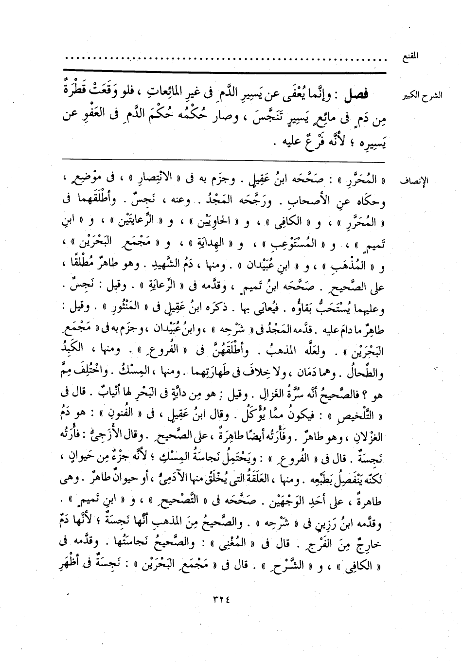 «المُحَرَّرِ»: صَحَّحَه ابنُ عَقِيلٍ. وجزَم به في «الانْتِصارِ»، في موْضِعٍ، وحكَاه عنِ الأصحابِ. ورَجَّحَه المَجْدُ. وعنه، نَجسٌ. وأطْلَقَهما في «المُحَرَّرِ»، و «الكافِي»، و «الحاويَين»، و «الرِّعايتَين»، و «ابنِ تَميمٍ»، و «المُسْتَوْعِبِ»، و «الهِدايَةِ»، و «مَجْمَع البَحْرَين»، و «المُذْهَبِ»، و «ابنِ عُبَيدان». ومنها، دَمُ الشَّهيدِ. وهو طاهرٌ مُطْلقًا، على الصَّحيحِ. صَحَّحَه ابنُ تَميمٍ، وقدَّمه في «الرِّعايَةِ». وقيل: نَجِسٌ. وعليهما يُسْتَحَبُّ بَقاؤُه. فيُعايَى بها. ذكرَه ابنُ عَقِيلٍ في «المَنْثُورِ». وقيل: طاهِرٌ ما دامَ عليه. قدَّمه المَجْدُ في «شَرْحِه»، وابنُ عُبَيدان، وجزَم به في «مَجْمَعِ البَحْرَين». ولعَلَّه المذهبُ. وأطْلَقَهُنَّ في «الفُروعِ». ومنها، الكَبِدُ والطِّحالُ. وهما دَمَان، ولا خِلافَ في طَهارَتِهما. ومنها، المِسْكُ. واخْتُلِفَ مِمَّ هو؟ فالصَّحيحُ أنَّه سُرَّةُ الغَزالِ. وقيل: هو مِن دابَّةٍ في البَحْرِ لها أنْيابٌ. قال في «التَّلْخيصِ»: فيكونُ ممَّا يُؤْكَلُ. وقال ابنُ عَقِيلٍ، في «الفُنونِ»: هو دَمُ الغزْلانِ، وهو طاهرٌ. وفَأْرَتُه أيضًا طاهِرَةٌ، على الصَّحيحِ. وقال الأزَجِيُّ: فأْرَتُه نَجِسَةٌ. قال في «الفُروعِ»: ويَحْتَمِلُ نَجاسَةُ المِسْكِ؛ لأنَّه جزْءٌ مِن حَيوانٍ، لكنّه يَنْفَصِلُ بَطبْعِه. ومنها، العَلَقَةُ التي يُخْلَقُ منها الآدَمِيُّ، أو حيوانٌ طاهرٌ. وهي طاهرةٌ، على أحَدِ الوَجْهَين. صَحَّحَه في «التَّصْحيحِ»، و «ابنِ تَميمٍ». وقدَّمه ابنُ رَزِين في «شَرْحِه». والصَّحيحُ مِنَ المذهبِ أنَّها نَجِسَةٌ؛ لأنَّها دَمٌ خارِجٌ مِنَ الفَرْجِ. قال في «المُغْنِي»: والصَّحيحُ نَجاسَتُها. وقدَّمه في «الكافِي»، و «الشَّرْحِ». قال في «مَجْمَعِ البَحْرَين»: نَجِسَةٌ في أظْهَرِ