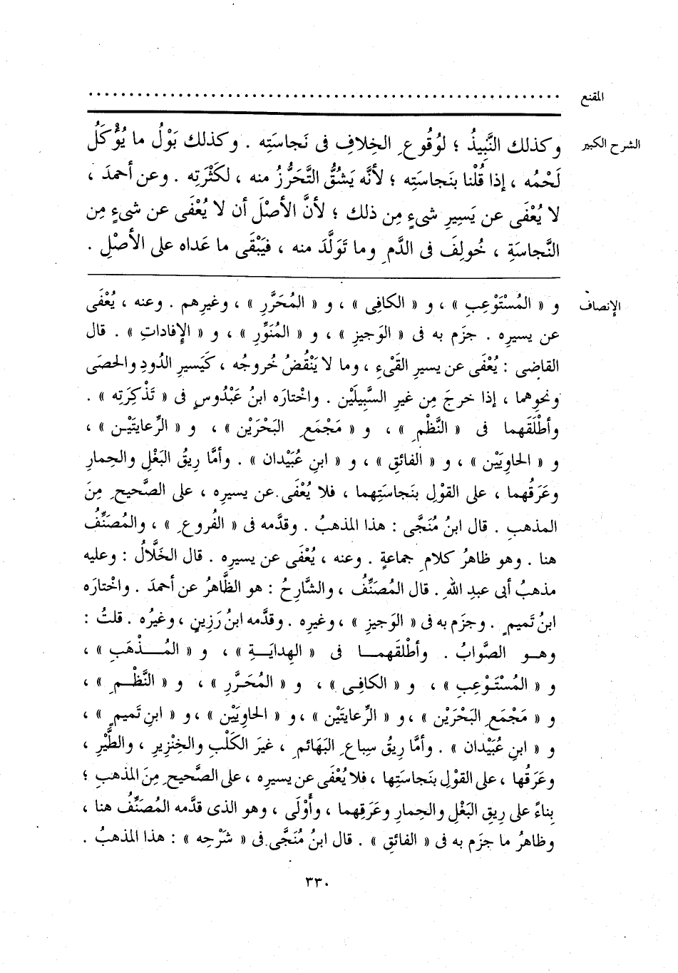 و «المُسْتَوْعِبِ»، و «الكافِي»، و «المُحَرَّرِ»، وغيرِهم. وعنه، يُعْفَى عن يسيرِه. جزَم به في «الوَجيزِ»، و «المُنَوِّرِ»، و «الإِفاداتِ». قال القاضي: يُعْفَى عن يسيرِ القَىْءِ، وما لا يَنْقُضُ خُروجُه، كَيَسيرِ الدُودِ والحصَى ونحوهما، إذا خرجَ مِن غيرِ السَّبِيلَين. واخْتارَه ابنُ عَبْدُوسٍ في «تَذْكِرَتِه». وأطْلَقَهما في «النَّظْمِ»، و «مَجْمعِ البَحْرَين»، و «الرِّعايَتْين»، و «الحاويَين»، و «الفائقِ»، و «ابنِ عُبَيدان». وأمَّا رِيقُ البَغْلِ والحِمارِ وعَرَقُهما، على القوْلِ بنَجاسَتِهما، فلا يُعْفَى عن يسيرِه، على الصَّحيحِ مِنَ المذهبِ. قال ابنُ مُنَجَّى: هذا المذهبُ. وقدَّمه في «الفُروعِ»، والمُصَنِّفُ هنا. وهو ظاهرُ كلامِ جماعةٍ. وعنه، يُعْفَى عن يسيرِه. قال الخَلَّالُ: وعليه مذهبُ أبي عبدِ اللهِ. قال المُصَنِّفُ، والشَّارِحُ: هو الظَّاهرُ عن أحمدَ. واخْتارَه ابنُ تَميمٍ. وجزَم به في «الوَجيزِ»، وغيرِه. وقدَّمه ابنُ رَزِينٍ، وغيرُه. قلتُ: وهو الصَّوابُ. وأطْلقَهما في «الهِدايَةِ»، و «المُذْهَبِ»، و «المُسْتَوْعِبِ»، و «الكافِي»، و «المُحَرَّرِ»، و «النَّظْمِ»، و «مَجْمَعِ البَحْرَين»، و «الرِّعايتَين»، و «الحاويَين»، و «ابنِ تَميمٍ»، و «ابنِ عُبَيدان». وأمَّا رِيقُ سِباعِ البَهَائمِ، غيرَ الكَلْبِ والخِنْزِيرِ، والطَّيرِ، وعَرَقُها، على القوْلِ بنَجاسَتِها، فلا يُعْفَى عن يسيرِه، على الصَّحيحِ مِنَ المذهبِ؛ بِناءً على رِيقِ البَغْلِ والحِمارِ وعَرَقِهما، وأَوْلَى، وهو الذي قدَّمه المُصَنِّفُ هنا، وظاهرُ ما جزَم به في «الفائقِ». قال ابنُ مُنَجَّى في «شَرْحِه»: هذا المذهبُ.