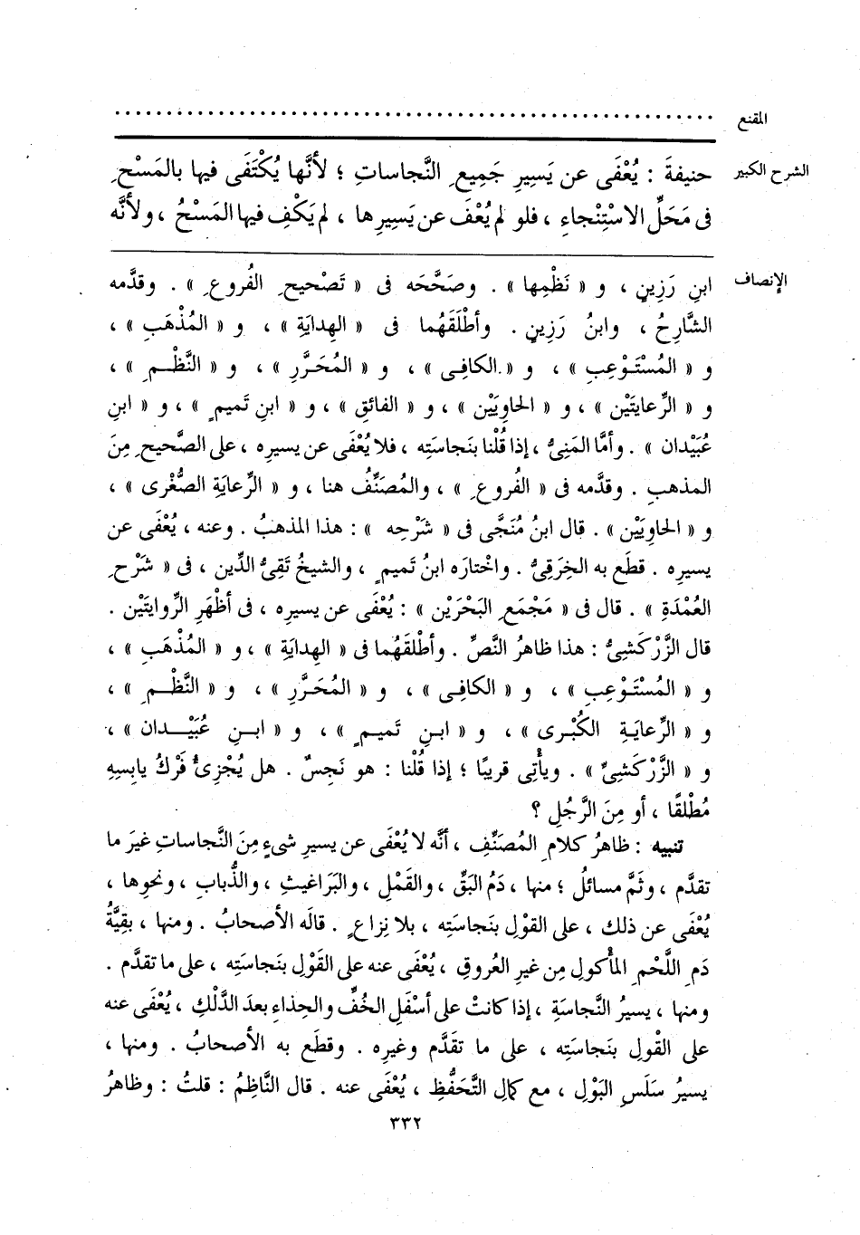 ابنِ رَزِينٍ، و «نَظْمِها». وصَحَّحَه في «تَصْحيحِ الفُروعِ». وقدَّمه الشَّارِحُ، وابنُ رَزِينٍ. وأطْلَقَهُما في «الهِدايَةِ»، و «المُذْهَبِ»، و «المُسْتَوْعِبِ»، و «الكافِي»، و «المُحَرَّرِ»، و «النَّظْمِ»، و «الرِّعايتَين»، و «الحاويَين»، و «الفائقِ»، و «ابنِ تَميمٍ»، و «ابنِ عُبَيدان». وأمَّا المَنِيُّ، إذا قُلْنا بنَجاسَتِه، فلا يُعْفَى عن يسيرِه، على الصَّحيحِ مِنَ المذهبِ. وقدَّمه في «الفُروعِ»، والمصَنِّفُ هنا، و «الرِّعايَةِ الصُّغْرى»، و «الحاويَين». قال ابنُ مُنَجَّى في «شَرْحِه»: هذا المذهب. وعنه، يُعْفَى عن يسيرِه. قطَع به الخِرَقِيُّ. واخْتارَه ابنُ تَميمٍ، والشيخُ تَقِيُّ الدِّين، في «شَرْحِ العُمْدَةِ». قال في «مَجْمَع البَحْرَين»: يُعْفى عن يسيرِه، في أظْهَرِ الرِّوايتَين. قال الزَّرْكَشِيُّ: هذا ظاهرُ النَّصِّ. وأطْلقَهُما في «الهِدايَةِ»، و «المُذْهَبِ»، و «المُستوْعِبِ»، و «الكافِي»، و «المُحَرَّرِ»، و «النَّظْمِ»، و «الرِّعايَةِ الكُبْرى»، و «ابنِ تَميمٍ»، و «ابنِ عُبَيدان»، و «الزَّرْكَشِيِّ». ويأْتِي قريبًا؛ إذا قُلْنا: هو نَجِسٌ. هل يُجْزِئُ فَرْكُ يابِسِهِ مُطْلقًا، أو مِنَ الرَّجُلِ؟