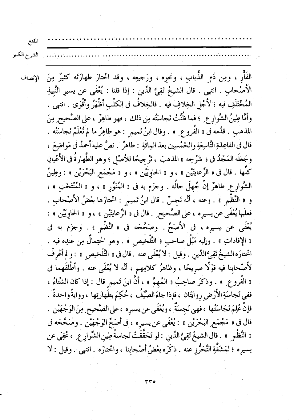 الفَأْرِ، ومِن دَمِ الذُّبابِ، ونحوه، ورَجيعِه، وقد اخْتارَ طهارَتَه كثيرٌ مِنَ الأصْحابِ. انتهى. قال الشيخُ تَقِيُّ الدِّينِ: إذا قلنا: يُعْفى عن يسيرِ النَّبِيذِ المُخْتَلَفِ فيه؛ لأجْلِ الخِلافِ فيه. فالخِلافُ في الكلْبِ أظْهَرُ وأقْوَى. انتهى. وأمَّا طِينُ الشَّوارِعِ؛ فما ظُنَّتْ نَجاسَتُه مِن ذلك، فهو طاهِرٌ، على الصَّحيحِ مِنَ المذهبِ. قدَّمه في «الفُروعِ». وقال ابنُ تَميمٍ: هو طاهِرٌ ما لم تُعْلَمْ نَجاسَتُه. قال في القاعِدَةِ التَّاسِعَةِ والخَمْسِين بعدَ المِائَةِ: طاهرٌ. نصَّ عليه أحمدُ في مَواضِعَ، وجَعَلَه المَجْدُ في «شَرْحِه» المذهبَ، تَرْجِيحًا للأصْلِ؛ وهو الطَّهارةُ في الأعْيانِ كلِّها. قال في «الرِّعايتَين»، و «الحاويَين»، و «مَجْمَعِ البَحْرَين»: وطِينُ الشَّوارِعِ طاهرٌ إنْ جُهِلَ حالُه. وجزَم به في «المُنَوِّرِ»، و «المُنْتَخَبِ»، و «النَّظْمِ». وعنه، أنَّه نَجِسٌ. قال ابنُ تَميمٍ: اخْتارَها بعْضُ الأصْحابِ. فعلَيها يُعْفَى عن يسيرِه، على الصَّحيحِ. قال في «الرِّعايتَين»، و «الحاويَين»: يُعْفَى عن يسيرِه، في الأصَحِّ. وصَحَّحَه في «النَّظْمِ». وجزَم به في «الإِفاداتِ». وإليه مَيلُ صاحبِ «التَّلْخصِ». وهو احْتِمالٌ مِن عندِه فيه. اخْتارَه الشيخُ تَقِيُّ الدِّينِ. وقيل: لا يُعْفَى عنه. قال في «التَّلْخيصِ»: ولم أعْرِفْ لأصْحابِنا فيه قوْلًا صرِيحًا، وظاهرُ كلامِهم، أنَّه لا يُعْفَى عنه. وأطْلقَهما في «الفُروعِ». وذكرَ صاحِبُ «المُهِمِّ»، أنَّ ابنَ تَميمٍ قال: إذا كان الشِّتاءُ، ففي نَجاسَةِ الأرْضِ رِوايَتَان، فإذا جاءَ الصَّيفُ، حُكِمَ بطَهارَتها، روايةً واحدةً. فإنْ عُلِمَ نَجَاسَتُها، فهي نَجِسَةٌ، ويُعْفَى عن يسيرِه، على الصَّحيحِ مِنَ الوَجْهَين. قال في «مَجْمَع البَحْرَين»: يُعْفَى عن يسيرِه، في أصَحِّ الوَجْهَين. وصَحَّحَه في «النَّظْمِ». قال الشيخُ تَقِيُّ الدِّينِ: لو تَحَقَّقَتْ نَجاسةُ طِينِ الشَّوارِعِ، عُفِيَ عن يسيرِه؛ لمَشَقَّةِ التَّحَرُّزِ عنه. ذكَرَه بعْضُ أصْحابِنا، واخْتارَه. انتهى. وقيل: لا