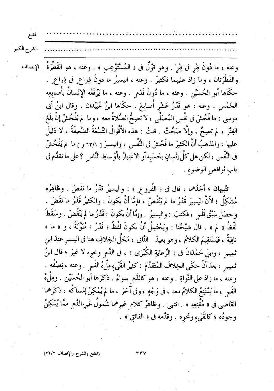 تنْبيهان؛ أحَدُهما، قال في «الفُروعِ»: واليسيرُ قدْرُ ما نقَضَ. وظاهِرُه مُشْكِلٌ؛ لأنَّ اليَسِيرَ قَدرُ ما لم يَنْقُضْ، فإمَّا أنْ يكونَ: والكثيرُ قَدْرُ ما نَقَضَ. وحصَل سَبْقُ قَلَم، فكتبَ: واليسيرُ. وإمَّا أنْ يكونَ: قَدْرُ ما لم يَنْقُضْ. وسَقَطَ لَفْظُ «لم». قال شيخُنا: ويَحْتَمِلُ أنْ يكونَ لفْظُ «قَدْرُ» مُنَوَّنَةً، و «ما» نافِيَةٌ، فيَسْتَقِيمَ الكلامُ، وهو بعيدٌ الثَّاني، مَحَلُّ الخِلافِ هنا في اليسيرِ عندَ ابنِ تَميم، وابنِ حَمْدَانَ في «الرعايةِ الكُبْرَى»، في الدَّمِ ونحوه لا غيرَ؛ قال ابنُ تَميم، بعدَ أنْ حكَى الخِلافَ المُتَقدِّمَ: كثيرُ القَىْءِ مِلْءُ الفَمِ. وعنه، نِصْفُه. وعنه، ما زادَ على النَّواةِ. وعنه، هو كالدَّم سواءً. ذكرَها أبو لحُسَين. ومِلْءُ الفَمِ، ما يَمْتَنِعُ الكلامُ معه، في وَجْهٍ، وفي آَخَرَ، ما لم يُمْكِنْ إمْساكُه، ذكَرَهما القاضي في «مُقْنِعِهِ». انتهى. وظاهرُ كلامِ غيرِهما شُمولُ غيرِ الدَّمِ ممَّا يُمْكِنُ وجودُه؛ كالقَىْءِ ونحوه. وقدَّمه في «الفائقِ».