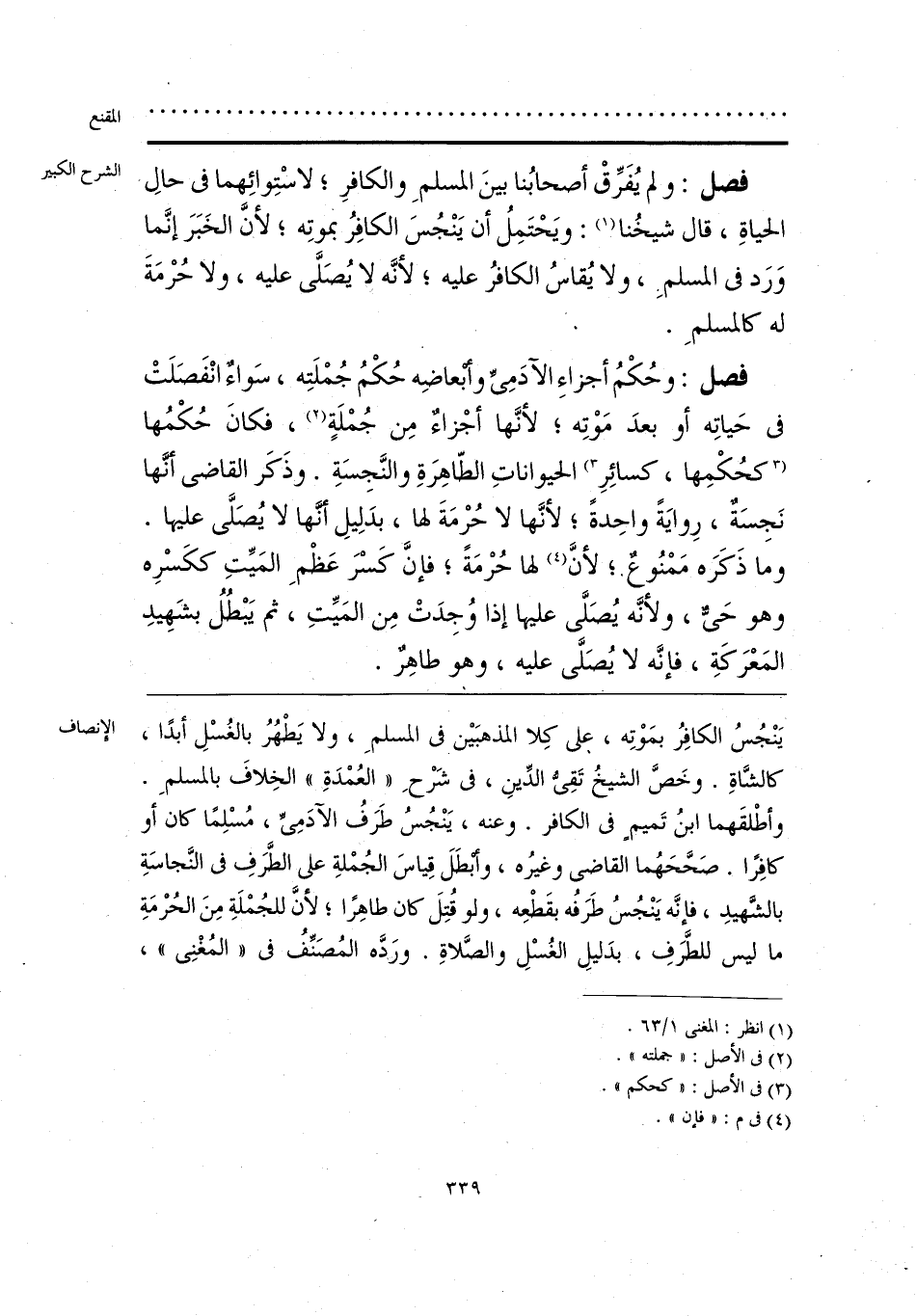 يَنْجُسُ الكافِرُ بمَوْتِه، على كِلا المذهبَين في المسلمِ، ولا يَطْهُرُ بالغُسْلِ أبدًا، كالشَّاةِ. وخَصَّ الشيخُ تَقِيُّ الدِّينِ، في شَرْحِ «العُمْدَةِ» الخِلافَ بالمسلمِ. وأطْلقَهما ابنُ تَميم في الكافر. وعنه، يَنْجُسُ طَرَفُ الآدَمِيِّ، مُسْلِمًا كان أو كافِرًا. صَحَّحَهُما القاضي وغيرُه، وأبطَلَ قِياسَ الجُمْلةِ على الطَّرَفِ في النَّجاسَةِ بالشهيدِ، فإنَّه يَنْجُسُ طَرَفُه بقَطْعِه، ولو قُتِلَ كان طاهِرًا؛ لأنَّ للجُمْلَةِ مِنَ الحُرْمَةِ ما ليس للطَّرَفِ، بدَليلِ الغُسْلِ والصَّلاةِ. ورَده المُصَنِّفُ في «المُغْنِي»،