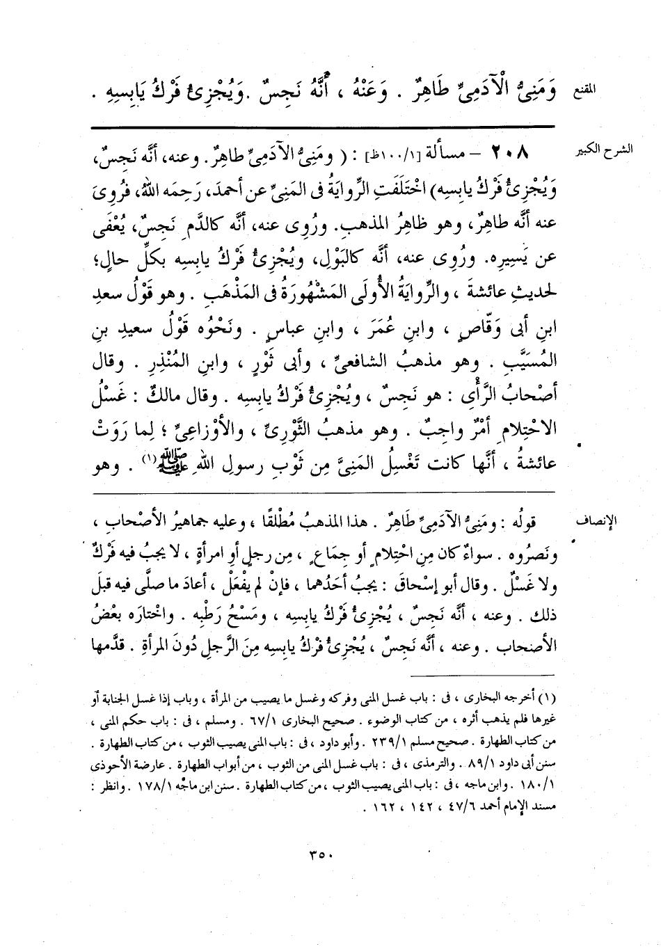 قولُه: ومَنِيُّ الآدَمِيِّ طَاهِرٌ. هذا المذهبُ مُطْلقًا، وعليه جماهيرُ الأصْحابِ، ونَصرُوه. سواءٌ كان مِنِ احْتِلام أو جِمَاع، مِن رجلٍ أو امرأةٍ، لا يجبُ فيه فَرْكٌ ولا غَسْلٌ. وقال أبو إسْحاقَ: يجبُ أحَدُهما، فإن لم يفْعَلْ، أعادَ ما صلَّى فيه قبلَ ذلك. وعنه، أنَّه نَجسٌ، يُجْزِئُ فَرْكُ يابِسِه، ومَسْحُ رَطْبِه. واخْتارَه بعْضُ الأصحاب. وعنه، أنَّه نَجِسٌ، يُجْزِئُ فرْكُ يابِسِه مِنَ الرَّجلِ دُونَ المرأةِ. قدَّمها