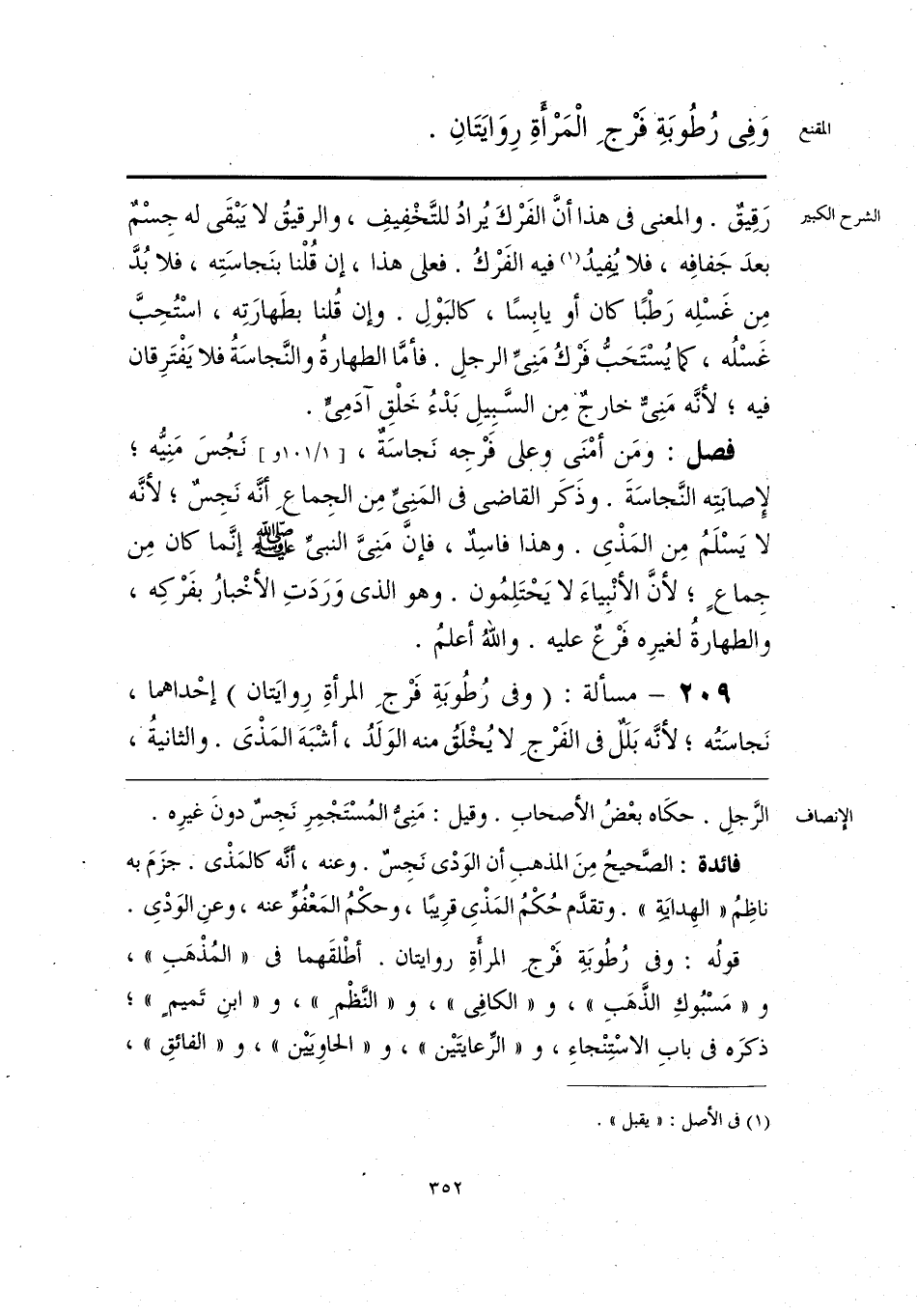 قولُه: وفي رُطُوبَةِ فَرْجِ المرأة روايتان. أطْلقَهما في «المُذْهَبِ»، و «مَسْبُوكِ الذَّهَبِ»، و «الكافي»، و «النَّظْمِ»، و «ابنِ تَميم»؛ ذكرَه في بابِ الاسْتِنْجاءِ، و «الرِّعايتَين»، و «الحاويَين»، و «الفائقِ»،
