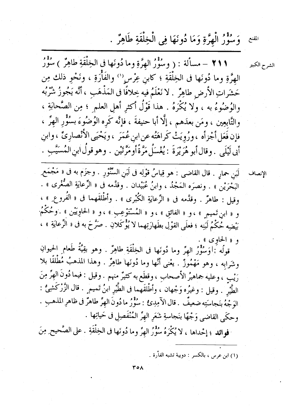 فوائد؛ إحْداها، لا يُكْرَهُ سُؤرُ الهِرِّ وما دُونَها في الخِلْقَةِ. على الصَّحيحِ مِنَ