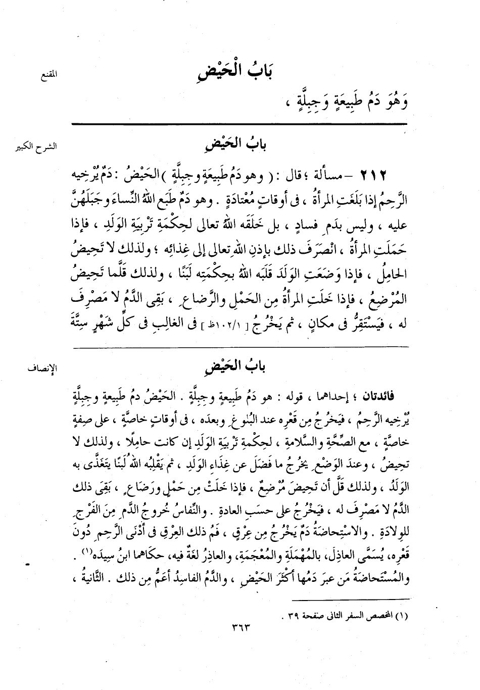 فائدتان؛ إحداهما، قوله: هو دَمُ طَبِيعةٍ وجِبِلَّةٍ. الحَيضُ دمُ طَبِيعةٍ وجِبِلَّةٍ يُرْخِيه الرَّحِمُ، فيَخرُجُ مِن قَعْرِه عند البُلوغ وبعدَه، في أوقاتٍ خاصَّةٍ، على صِفةٍ خاصَّةٍ، مع الصِّحَّةِ والسَّلامةِ، لحِكْمةِ تَرْبيَةِ الوَلَدِ إن كانت حامِلًا، ولذلك لا تحِيضُ، وعندَ الوَضْعِ يخرُجُ ما فَضَلَ عن غِذَاءِ الوَلَدِ، ثم، يَقْلِبُه اللهُ لَبنًا يتَغَذَّى به الوَلَدُ، ولذلك قَلَّ أن تَحِيضَ مُرْضِعٌ، فإذا خَلَتْ مِن حَمْل ورَضَاع، بَقِيَ ذلك الدَّمُ لا مَصْرِفَ له، فيَخْرُجُ على حسَبِ العادةِ. والنِّفاسُ خُروج الدَّمِ مِنَ الفَرْجٍ للولادَة. والاسْتِحاضَةُ دَم يَخْرُجُ مِن عِرْقٍ، فَمُ ذلك العِرْقِ في أدْنَى الرَّحِمِ دُون قَعْرِه، يُسَمَّى العاذِلَ، بالمُهْمَلَةِ والمُعْجَمَةِ، والعاذِرُ لغَةٌ فيه، حكَاهما ابنُ سِيدَه (¬1). والمُسْتَحاضَةُ مَن عبرَ دَمُها أكثرَ الحَيضِ، والدَّمُ الفاسِدُ أعَمُّ مِن ذلك. الثَّانيةُ،