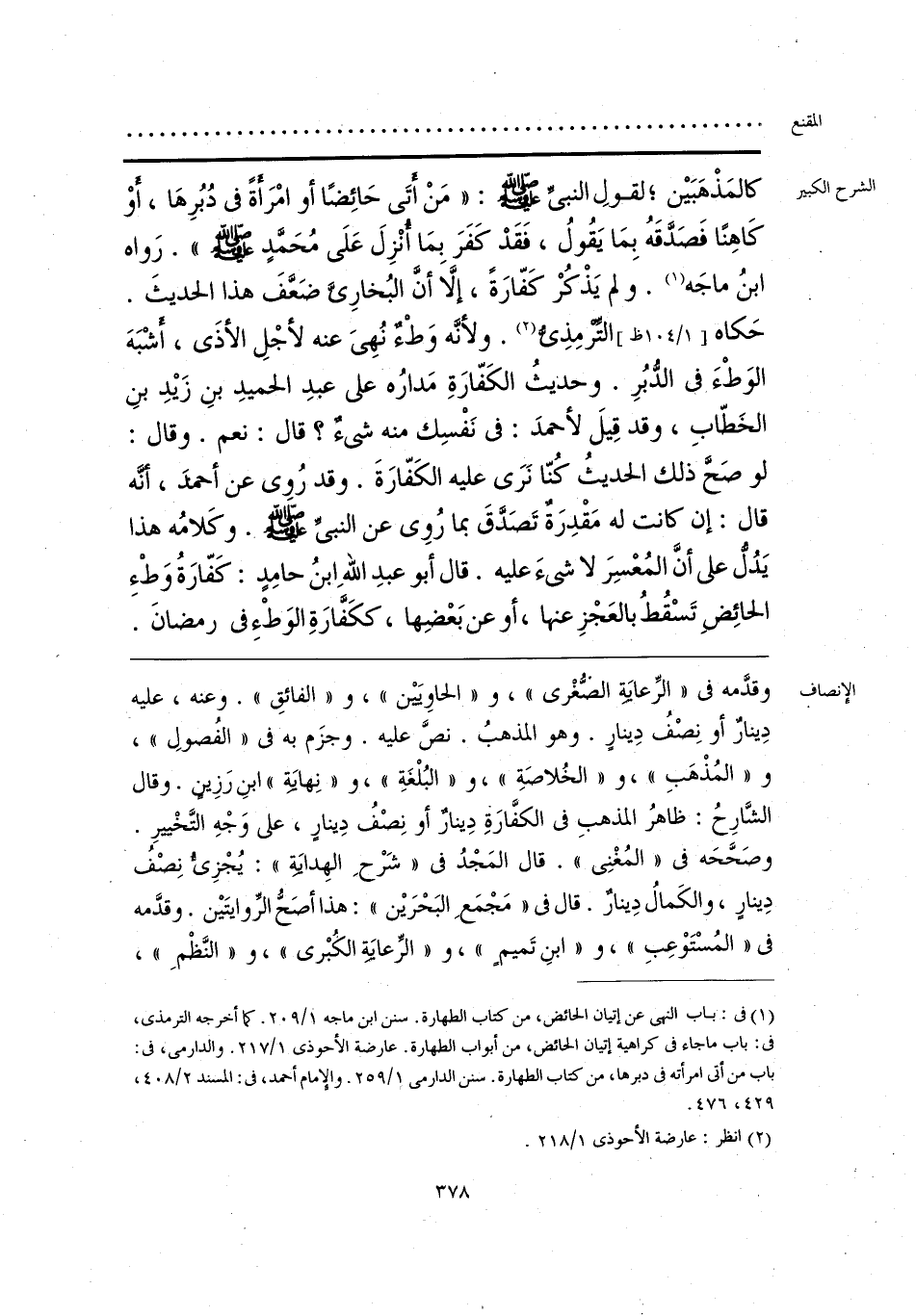وقدَّمه في «الرِّعايَةِ الصُّغْرى»، و «الحاويَين»، و «الفائقِ». وعنه، عليه دِينارٌ أو نِصْفُ دِينارٍ. وهو المذهبُ. نصَّ عليه. وجزَم به في «الفُصولِ»، و «المُذْهَبِ»، و «الخُلاصَةِ»، و «البُلْغَةِ»، و «نِهايةِ» ابنِ رَزِينٍ. وقال الشَّارِحُ: ظاهرُ المذهبِ في الكفَّارَةِ دِينارٌ أو نِصْفُ دِينارٍ، على وَجْهِ التَّخْييرِ. وصَحَّحَه في «المُغْنِي». قال المَجْدُ في «شَرْحِ الهِدايَةِ»: يُجْزِئُ نِصْفُ دِينارٍ، والكَمالُ دِينارٌ. قال في «مَجْمَع البَحْرَين»: هذا أصَحُّ الرِّوايتَين. وقدَّمه في «المُسْتَوْعِبِ»، و «ابنِ تَميمٍ»، و «الرِّعايَةِ الكُبْرى»، و «النَّظْمِ»،