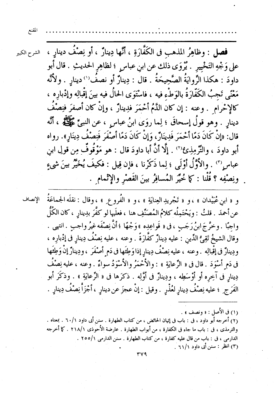 و «ابنِ عُبَيدان»، و «تَجْريدِ العِنايَة»، و «الفُروعِ»، وقال: نقلَه الجماعَةُ عن أحمدَ. قلتُ: ويَحْتَمِلُه كلامُ المُصَنِّفِ هنا، فعلَيها لو كفَّرَ بدِينارٍ، كان الكُلُّ واجِبًا. وخرَّجَ ابنُ رَجَبٍ، في «قَواعِدِه» وَجْهًا؛ أنَّ نِصْفَه غيرُ واجبٍ. انتهى. وقال الشيخُ تَقِيُّ الدِّينِ: عليه دِينارٌ كفَّارَةً. وعنه، عليه نِصْف دِينارٍ في إدْبارِه، ودِينارٌ في إقْبالِه. وعنه، عليه نِصْفُ دِينارٍ إذا وَطِئَها في دَم أصْفَرَ، ودِينارٌ إنْ وَطِئَها في دَم أسْوَدَ. قال في «الرِّعايَةِ»: والأحْمَرُ والأسْوَدُ سواءٌ. وعنه، عليه نِصْفُ دِينارٍ في آخِرِه أو أوْسَطِه، ودِينارٌ في أوَّلِه. ذكرَها في «الرِّعايَةِ». وذكَرَ أبو الفَرَجِ؛ عليه نِصْفُ دِينارٍ لعُذْرٍ. وقيل: إنْ عجزَ عن دينارٍ، أجْزَأ نِصْفُ دِينارٍ.
