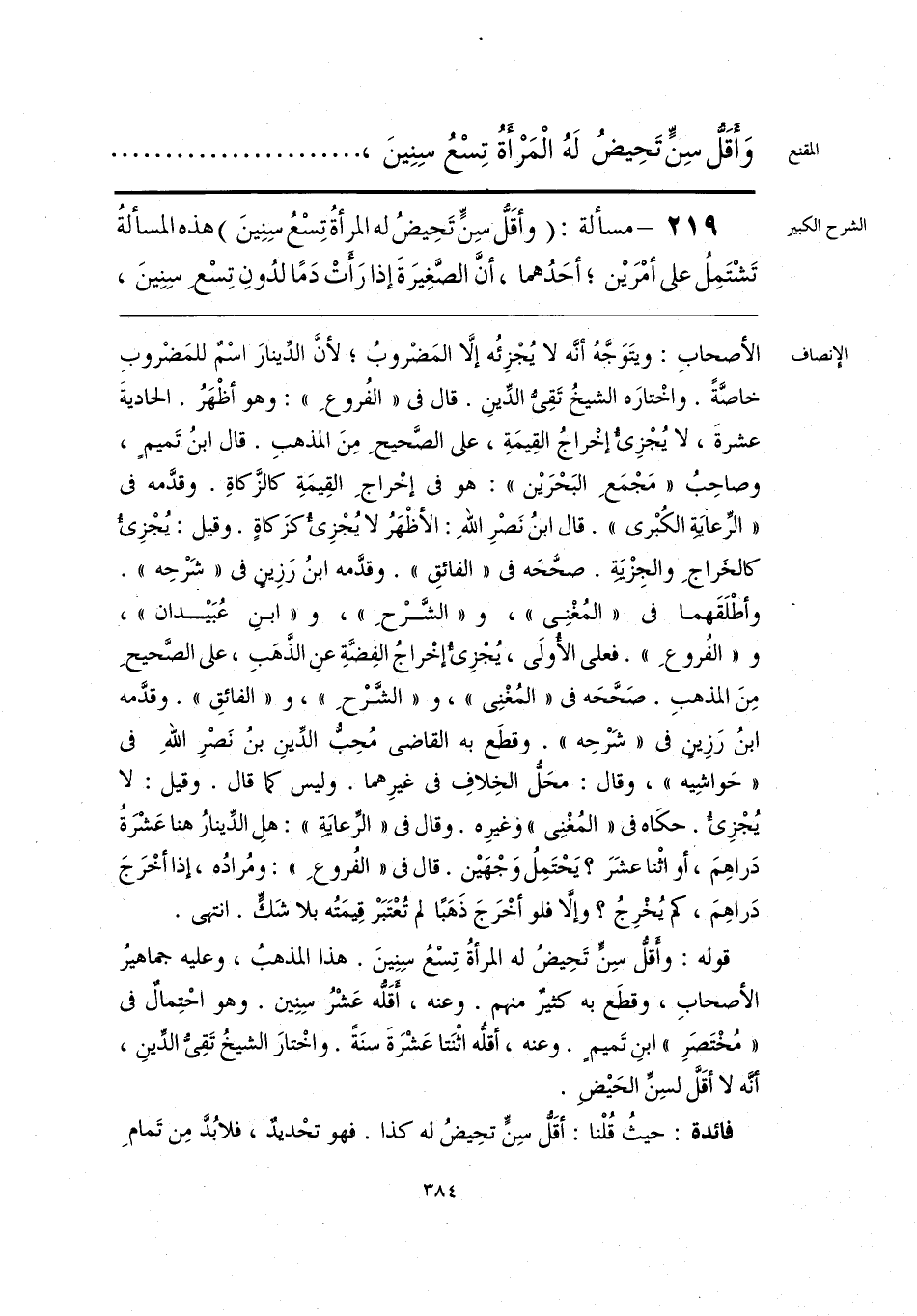 قوله: وأقلُّ سِنٍّ تَحِيضُ له المرأةُ تِسْعُ سِنِينَ. هذا المذهبُ، وعليه جماهيرُ الأصحابِ، وقطَع به كثيرٌ منهم. وعنه، أقَلُّه عَشْرُ سنين. وهو احْتِمالٌ في «مُخْتَصَرِ» ابنِ تَميمٍ. وعنه، أقلُّه اثْنَتا عَشْرَةَ سنَةً. واخْتارَ الشيخُ تَقِيُّ الدِّينِ، أنَّه لا أَقَّل لسِنِّ الحَيضِ.
