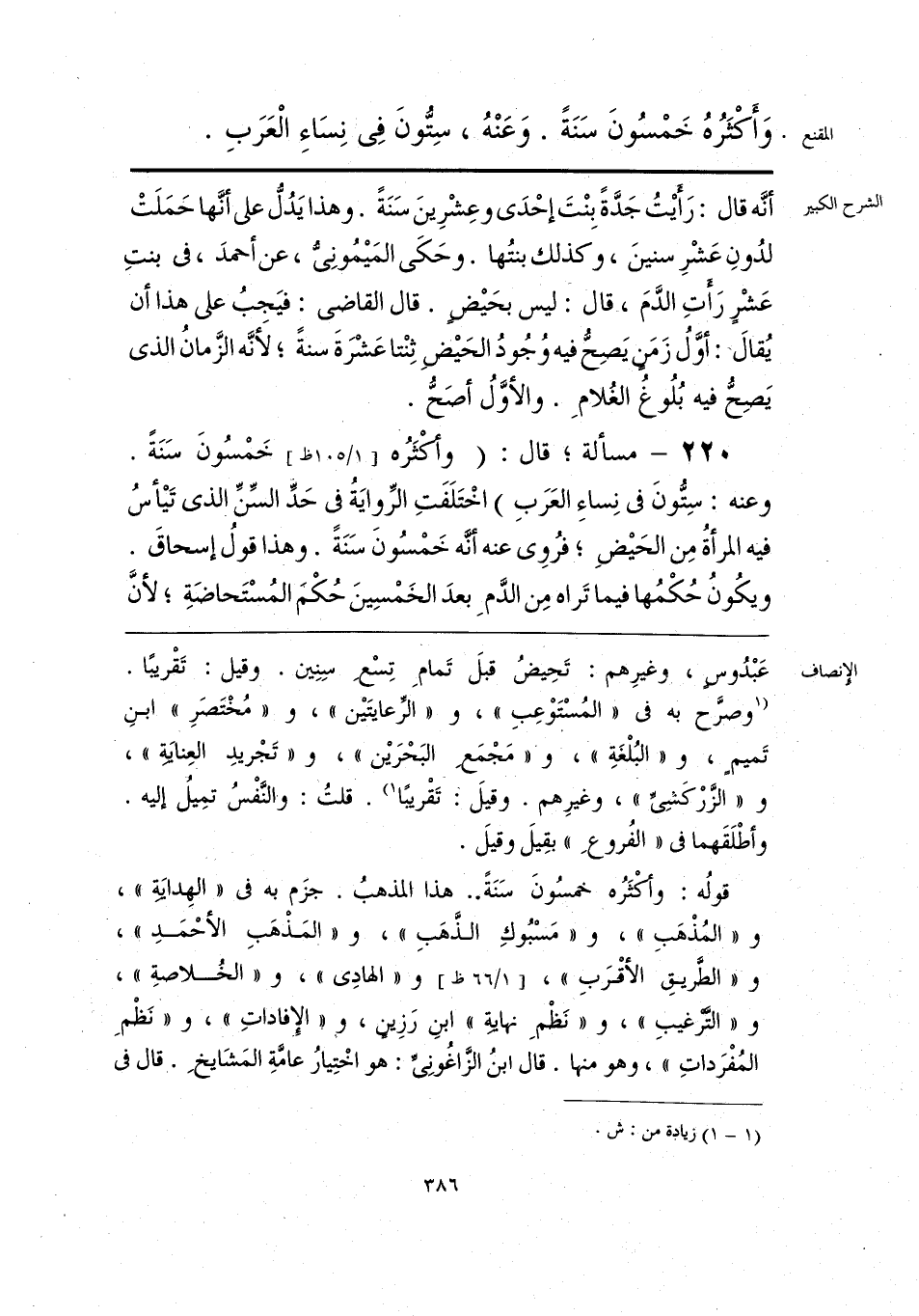 قولُه: وأكثَرُه خمسُونَ سَنَةً. . هذا المذهبُ. جزَم به في «الهِدايَةِ»، و «المُذْهَبِ»، و «مَسْبُوكِ الذَّهَبِ»، و «المَذْهَبِ الأحْمَدِ»، و «الطرَّيقِ الأقْرَبِ»، و «الهادِي»، و «الخُلاصةِ»، و «الترغيبِ»، و «نَظْمِ نهايَةِ» ابنِ رَزِين، و «الإِفاداتِ»، و «نَظْم المُفْرَداتِ»، وهو منها. قال ابنُ الزَّاغُونِيِّ: هو اخْتِيارُ عامَّةِ المَشَايخِ. قال في