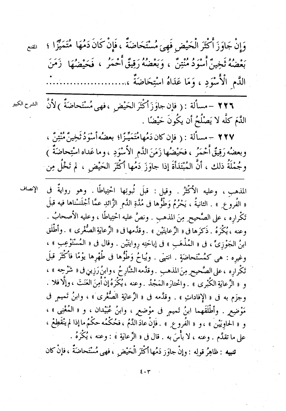 وَإنْ جَاوَزَ أَكْثَرَ الْحَيضِ فَهِيَ مُسْتَحَاضَةٌ، فَإِنْ كَانَ دَمُهَا مُتَمَيِّزًا؛ بَعْضُهُ ثَخِينٌ أسْوَدُ مُنْتِنٌ، وَبَعْضُهُ رَقِيقٌ أَحمَرُ، فَحَيضُهَا زَمَنَ الدَّمِ الأسْوَدِ، وَمَا عَدَاهُ اسْتِحَاضَةٌ،
