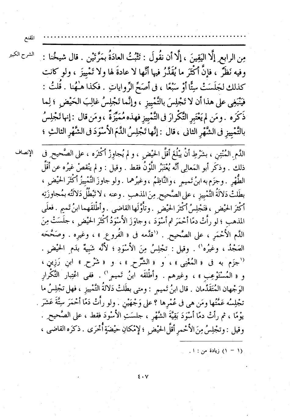 الدَّمِ المُنْتِنِ، بشَرْطِ أنْ يبْلُغَ أقلَّ الحيضِ، ولم يُجاوزْ أكْثَرَه، على الصَّحيحِ في ذلك. وذكَر أبو المَعالِي أنَّه يُعْتَبَرُ اللَّوْنُ فقط. وقيل: ولم ينْقصْ غيرُه عن أقَلِّ الطُّهْرِ. وجزَم به ابنُ تَميمٍ، والنَّاظِمُ، وغيرُهما. ولو جاوزَ التَّمْيِيزُ أكْثَرَ الحيضِ، بطَلتْ دَلالةُ التَّمْيِيزِ، على الصَّحيحِ مِنَ المذهبِ. وعنه، لا تَبْطُلُ دَلالتُه بمُجاوزَته أكْثرَ الحيضِ، فتَجْلِسُ أكثرَ الحيضِ. وتأوَّلَها القاضي. وأطْلقَهما ابنُ تَميمٍ. فعلَى المذهب؛ لو رأَتْ دمًا أحْمَرَ ثم أسْوَدَ، وجاوَزَ الأسْوَدُ أكثَرَ الحيضِ، جلَسَتْ مِنَ الدَّم الأحْمَرِ، على الصَّحيحِ. [قدَّمه في «الفُروعِ»، وغيرِه. وصَحَّحَه المَجْدُ، وغيرُه] (1). وقيل: تجْلِسُ مِنَ الأسْوَدِ؛ لأنَّه شَبِيهٌ بدَمِ الحيضِ. [جزَم به في «المُغْنِي»، و «الشَّرْحِ»، و «شَرْحِ» ابنِ رَزِينٍ، و «المُسْتَوْعِب»، وغيرهم. وأطْلقَه ابنُ تَميمٍ] (¬1). ففي اعْتِبار التَّكْرارِ الوَجْهان المُتَقَدِّمان. قال ابنُ تَميمٍ: ومتى بطَلتْ دَلالةُ التَّمْييزِ، فهل تجْلِسُ ما تجْلِسُه عَمَّتُها ومَن هي في عُمْرِها؟ على وَجْهَينِ. ولو رأَتْ دَمًا أحْمَرَ سِتَّةَ عَشَرَ. يوْمًا، ثم رأتْ دمًا أسْوَدَ بَقِيَّةَ الشَّهْرِ، جلسَتِ الأسْودَ فقط، على الصَّحيحِ. وقيل: وتجْلِسُ مِنَ الأحْمرِ أقلَّ الحيضِ؛ لإِمْكانِ حيضَةٍ أُخْرَى. ذكرَه القاضي،