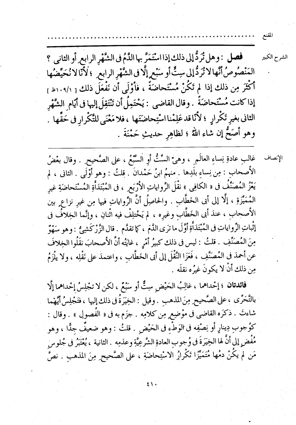 فائدتان؛ إحْداهما، غالِبُ الحَيضِ سِتٌّ أو سَبْعٌ، لكن لا تجْلِسُ إحْداهما إلَّا بالتَّحَرِّي، على الصَّحيحِ مِنَ المذهبِ. وقيل: الخِيَرَةُ في ذلك إليها، فتَجْلِسُ أيُّهما شاءتَ. ذكرَه القاضي في موْضِعٍ مِن كلامِه. جزَم به في «الفُصولِ». وقال: كوُجوبِ دينارٍ أو نِصْفِه في الوَطْءِ في الحَيضِ. قلتُ: وهو ضعيف جِدًّا، وهو مُفْضٍ إلى أنَّ لها الخِيَرَةَ في وُجوبِ العادةِ الشَّرعِيَّةِ وعدَمِه. الثانية، يُعْتَبَرُ في جُلوسِ مَن لم يكُنْ دمُها مُتَمَيِّزًا تَكْرارُ الاسْتِحاضَةِ، على الصَّحيحِ مِنَ المذهبِ. نصَّ