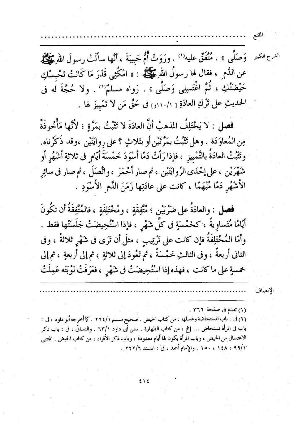 وَصَلِّي». مُتَّفَق عليه (¬1). ورَوَتْ أُمُّ حَبيبَةَ، أَنَّها سألَتْ رسولَ اللهِ - صلى الله عليه وسلم - عن الدَّمِ، فقال لها رسولُ اللهِ - صلى الله عليه وسلم -: «امْكُثِي قَدْرَ مَا كَانَتْ تَحْبِسُكِ حَيضَتُكِ، ثُمَّ اغْتَسِلِي وَصَلِّي». رَواه مسلمٌ (¬2). ولا حُجَّةَ له في الحديثِ على تَرْكِ العادَةِ في حَقِّ مَن لا تَمْيِيزَ لها.