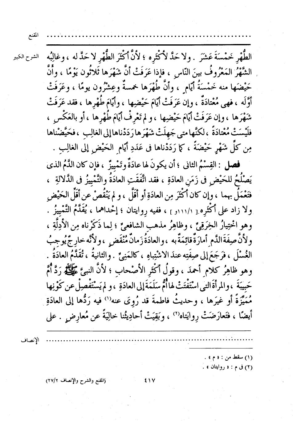 فصل: القِسْمُ الثاني؛ أن يكونَ لها عادَةٌ وتَمْيِيزٌ، فإن كان الدَّمُ الَّذي يَصْلُحُ للحَيضِ في زَمَنِ العادَةِ، فقد اتَّفَقَتِ العادَةُ والتَّمْيِيزُ في الدَّلالةِ، فتَعْمَلُ بهما، وإن كان أكْثَرَ مِن العادَةِ أو أقَلَّ، ولم يَنْقُصْ عن أقَلِّ الحَيضِ ولا زاد على أكْثَرِه، ففيه رِوايتان، إحْداهما، يُقَدَّمُ التَّمْيِيزُ. وهو اخْتِيارُ الخِرَقِيِّ، وظاهِرُ مذهبِ الشافعيِّ؛ لِما ذَكَرْناه مِن الأدِلَّةِ، ولأنَّ صِفَةَ الدَّمِ أمارَةٌ قائِمَةٌ به، والعادَةُ زَمانٌ مُنْقَضٍ، ولأنَّه خارِجٌ يُوجِبُ الغُسْلَ، فرَجَعَ إلى صِفَتِه عندَ الاشْتِباهِ، كالمَنِيِّ. والثانيةُ، تُقَدَّمُ العادَةُ. وهو ظاهِرُ كلامِ أحمدَ، وقولُ أكْثَرِ الأصْحابِ؛ لأنَّ النبيَّ - صلى الله عليه وسلم - رَدَّ أُمَّ حَبِيبَةَ، والمرأةَ التي اسْتَفْتَتْ لها أُمُّ سَلَمَةَ إلى العادَةِ، ولم يَسْتَفْصِلْ عن كَوْنِها مُمَيِّزةً أو غيرَها، وحديثُ فاطمةَ قد رُوِيَ عنه (¬1) فيه رَدُّها إلى العادَةِ أيضًا، فتَعارَضَتْ رِوايَتاه (¬2)، وبَقِيَتْ أحادِيثُنا خالِيَةً عن مُعارِضٍ. على